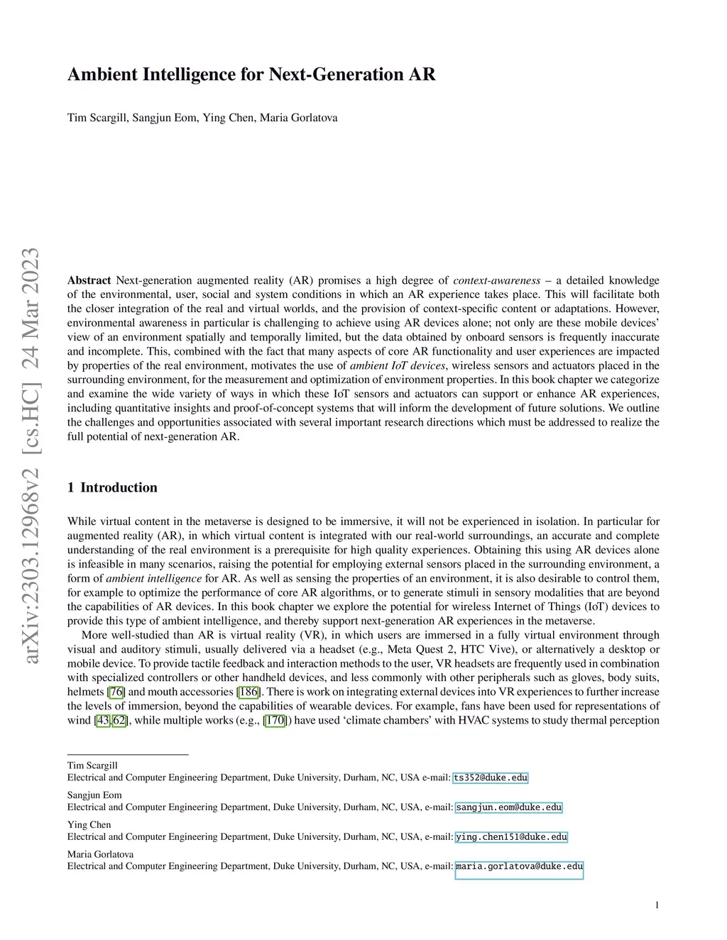 Next-generation augmented reality (AR) promises a high degree of context-awareness - a detailed knowledge of the environmental, user, social and system conditions in which an AR experience takes place. This will facilitate both the closer integration of the real and virtual worlds, and the provision of context-specific content or adaptations. However, environmental awareness in particular is challenging to achieve using AR devices alone; not only are these mobile devices' view of an environment spatially and temporally limited, but the data obtained by onboard sensors is frequently inaccurate and incomplete. This, combined with the fact that many aspects of core AR functionality and user experiences are impacted by properties of the real environment, motivates the use of ambient IoT devices, wireless sensors and actuators placed in the surrounding environment, for the measurement and optimization of environment properties. In this book chapter we categorize and examine the wide variety of ways in which these IoT sensors and actuators can support or enhance AR experiences, including quantitative insights and proof-of-concept systems that will inform the development of future solutions. We outline the challenges and opportunities associated with several important research directions which must be addressed to realize the full potential of next-generation AR.