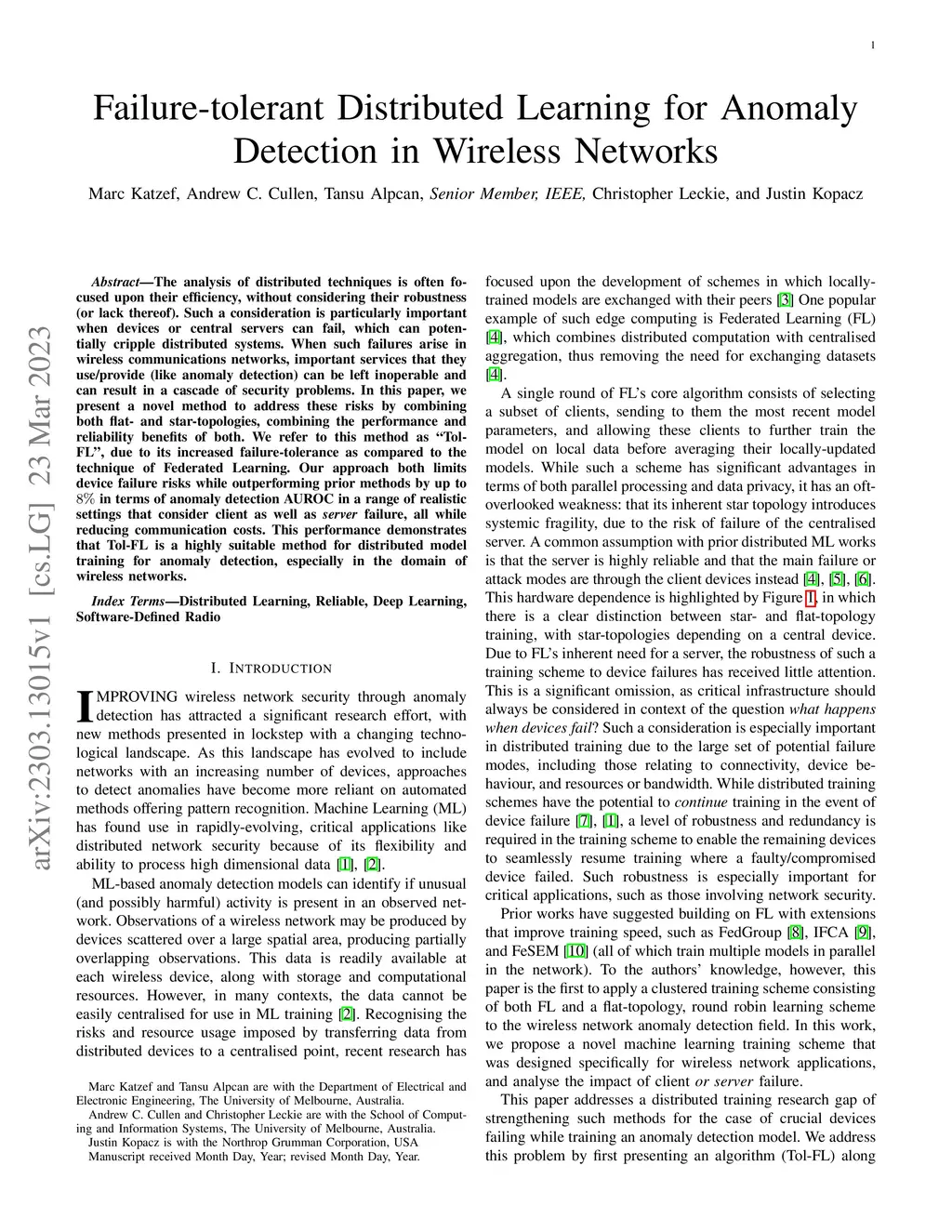 The analysis of distributed techniques is often focused upon their efficiency, without considering their robustness (or lack thereof). Such a consideration is particularly important when devices or central servers can fail, which can potentially cripple distributed systems. When such failures arise in wireless communications networks, important services that they use/provide (like anomaly detection) can be left inoperable and can result in a cascade of security problems. In this paper, we present a novel method to address these risks by combining both flat- and star-topologies, combining the performance and reliability benefits of both. We refer to this method as "Tol-FL", due to its increased failure-tolerance as compared to the technique of Federated Learning. Our approach both limits device failure risks while outperforming prior methods by up to 8% in terms of anomaly detection AUROC in a range of realistic settings that consider client as well as server failure, all while reducing communication costs. This performance demonstrates that Tol-FL is a highly suitable method for distributed model training for anomaly detection, especially in the domain of wireless networks.