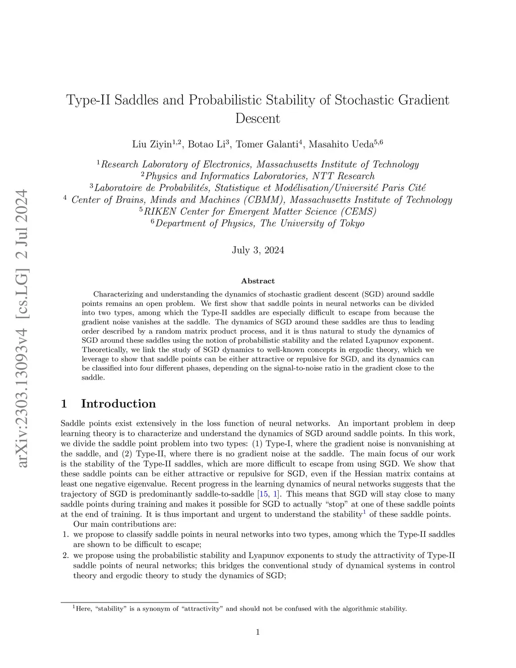 Characterizing and understanding the dynamics of stochastic gradient descent (SGD) around saddle points remains an open problem. We first show that saddle points in neural networks can be divided into two types, among which the Type-II saddles are especially difficult to escape from because the gradient noise vanishes at the saddle. The dynamics of SGD around these saddles are thus to leading order described by a random matrix product process, and it is thus natural to study the dynamics of SGD around these saddles using the notion of probabilistic stability and the related Lyapunov exponent. Theoretically, we link the study of SGD dynamics to well-known concepts in ergodic theory, which we leverage to show that saddle points can be either attractive or repulsive for SGD, and its dynamics can be classified into four different phases, depending on the signal-to-noise ratio in the gradient close to the saddle.