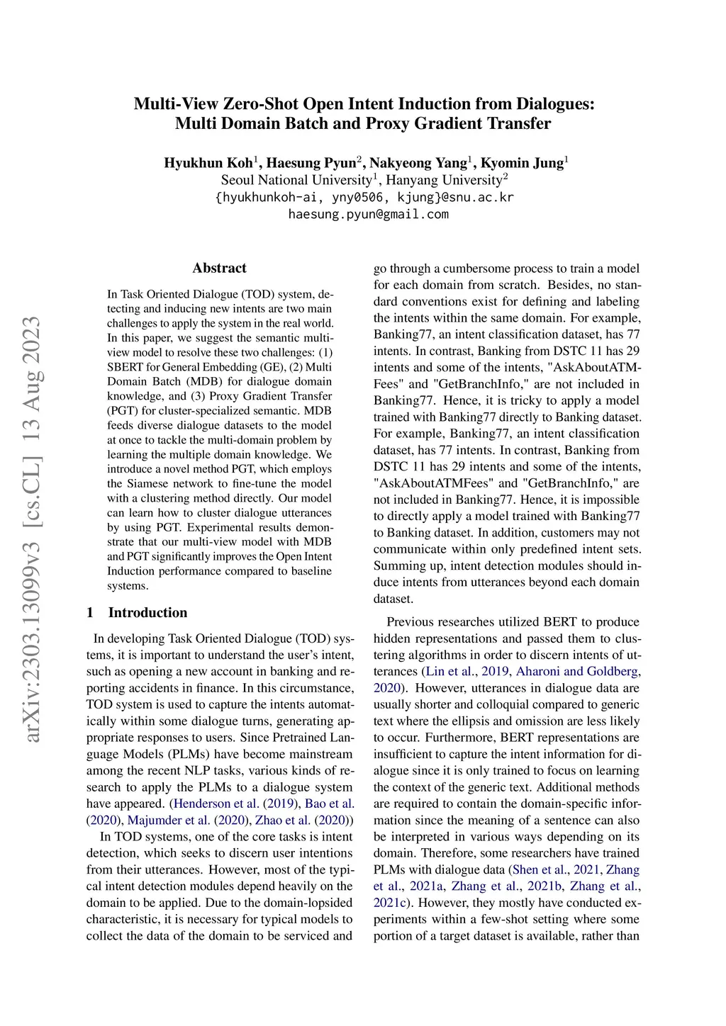 In Task Oriented Dialogue (TOD) system, detecting and inducing new intents are two main challenges to apply the system in the real world. In this paper, we suggest the semantic multi-view model to resolve these two challenges: (1) SBERT for General Embedding (GE), (2) Multi Domain Batch (MDB) for dialogue domain knowledge, and (3) Proxy Gradient Transfer (PGT) for cluster-specialized semantic. MDB feeds diverse dialogue datasets to the model at once to tackle the multi-domain problem by learning the multiple domain knowledge. We introduce a novel method PGT, which employs the Siamese network to fine-tune the model with a clustering method directly.Our model can learn how to cluster dialogue utterances by using PGT. Experimental results demonstrate that our multi-view model with MDB and PGT significantly improves the Open Intent Induction performance compared to baseline systems.