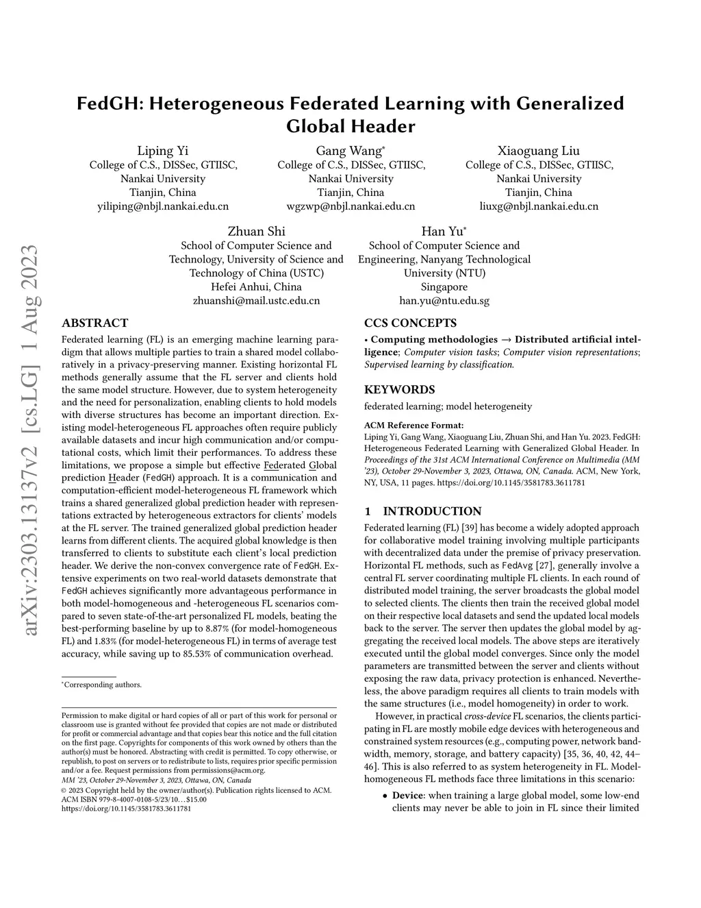 FedGH: Heterogeneous Federated Learning with Generalized Global Header