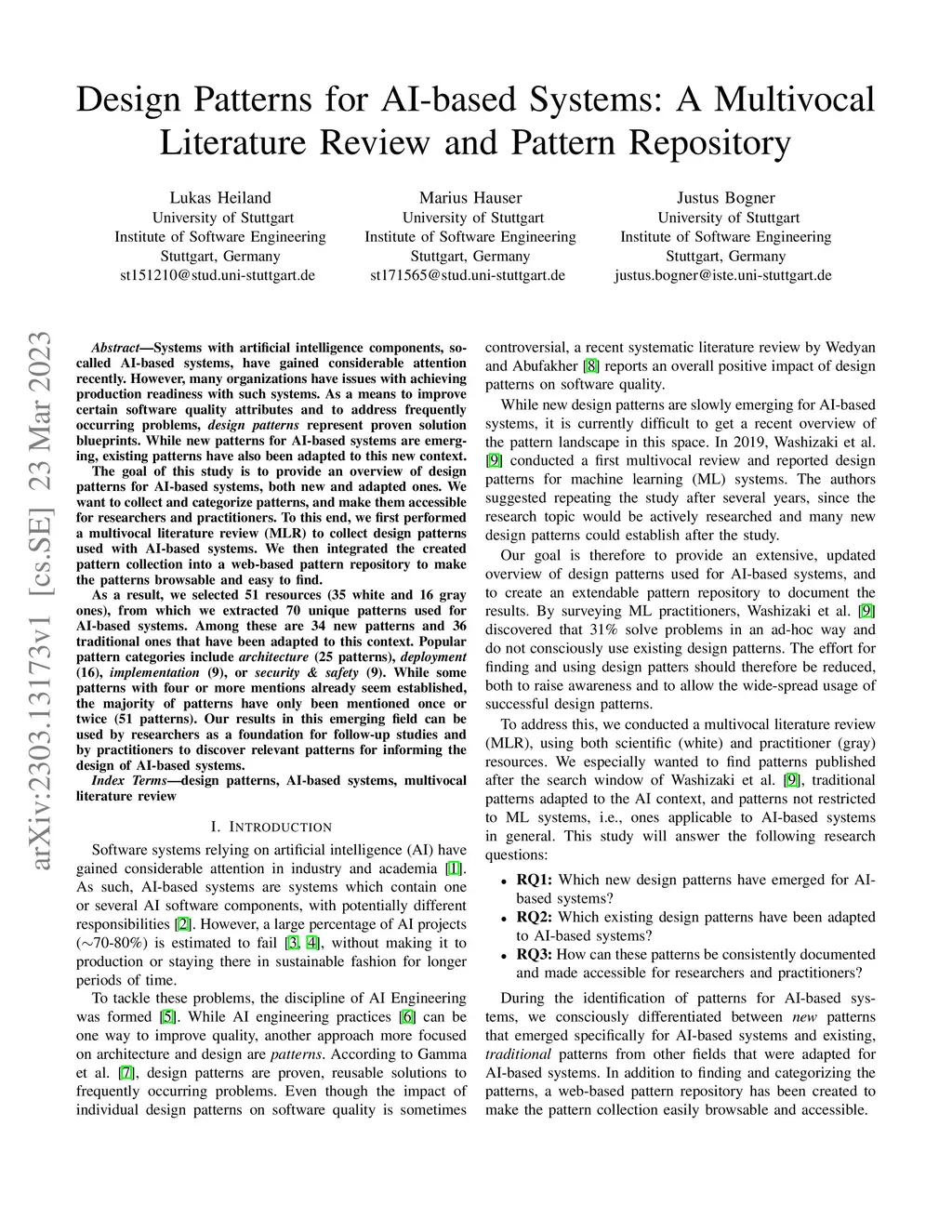 Systems with artificial intelligence components, so-called AI-based systems, have gained considerable attention recently. However, many organizations have issues with achieving production readiness with such systems. As a means to improve certain software quality attributes and to address frequently occurring problems, design patterns represent proven solution blueprints. While new patterns for AI-based systems are emerging, existing patterns have also been adapted to this new context. The goal of this study is to provide an overview of design patterns for AI-based systems, both new and adapted ones. We want to collect and categorize patterns, and make them accessible for researchers and practitioners. To this end, we first performed a multivocal literature review (MLR) to collect design patterns used with AI-based systems. We then integrated the created pattern collection into a web-based pattern repository to make the patterns browsable and easy to find. As a result, we selected 51 resources (35 white and 16 gray ones), from which we extracted 70 unique patterns used for AI-based systems. Among these are 34 new patterns and 36 traditional ones that have been adapted to this context. Popular pattern categories include "architecture" (25 patterns), "deployment" (16), "implementation" (9), or "security & safety" (9). While some patterns with four or more mentions already seem established, the majority of patterns have only been mentioned once or twice (51 patterns). Our results in this emerging field can be used by researchers as a foundation for follow-up studies and by practitioners to discover relevant patterns for informing the design of AI-based systems.