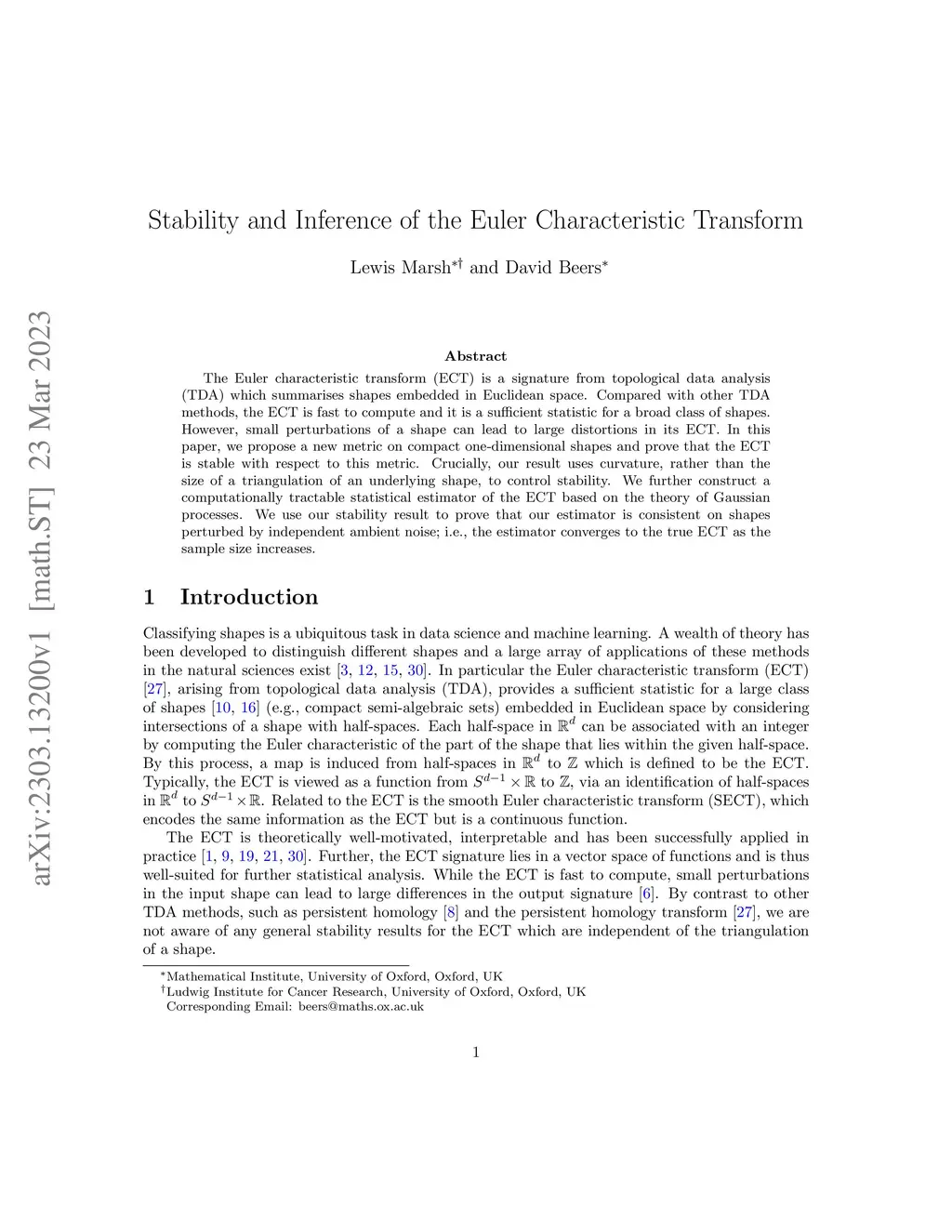 The Euler characteristic transform (ECT) is a signature from topological data analysis (TDA) which summarises shapes embedded in Euclidean space. Compared with other TDA methods, the ECT is fast to compute and it is a sufficient statistic for a broad class of shapes. However, small perturbations of a shape can lead to large distortions in its ECT. In this paper, we propose a new metric on compact one-dimensional shapes and prove that the ECT is stable with respect to this metric. Crucially, our result uses curvature, rather than the size of a triangulation of an underlying shape, to control stability. We further construct a computationally tractable statistical estimator of the ECT based on the theory of Gaussian processes. We use our stability result to prove that our estimator is consistent on shapes perturbed by independent ambient noise; i.e., the estimator converges to the true ECT as the sample size increases.