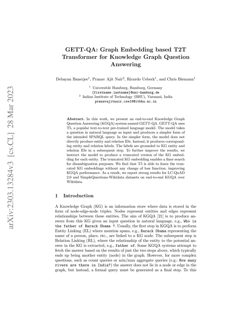 GETT-QA: Graph Embedding based T2T Transformer for Knowledge Graph Question Answering