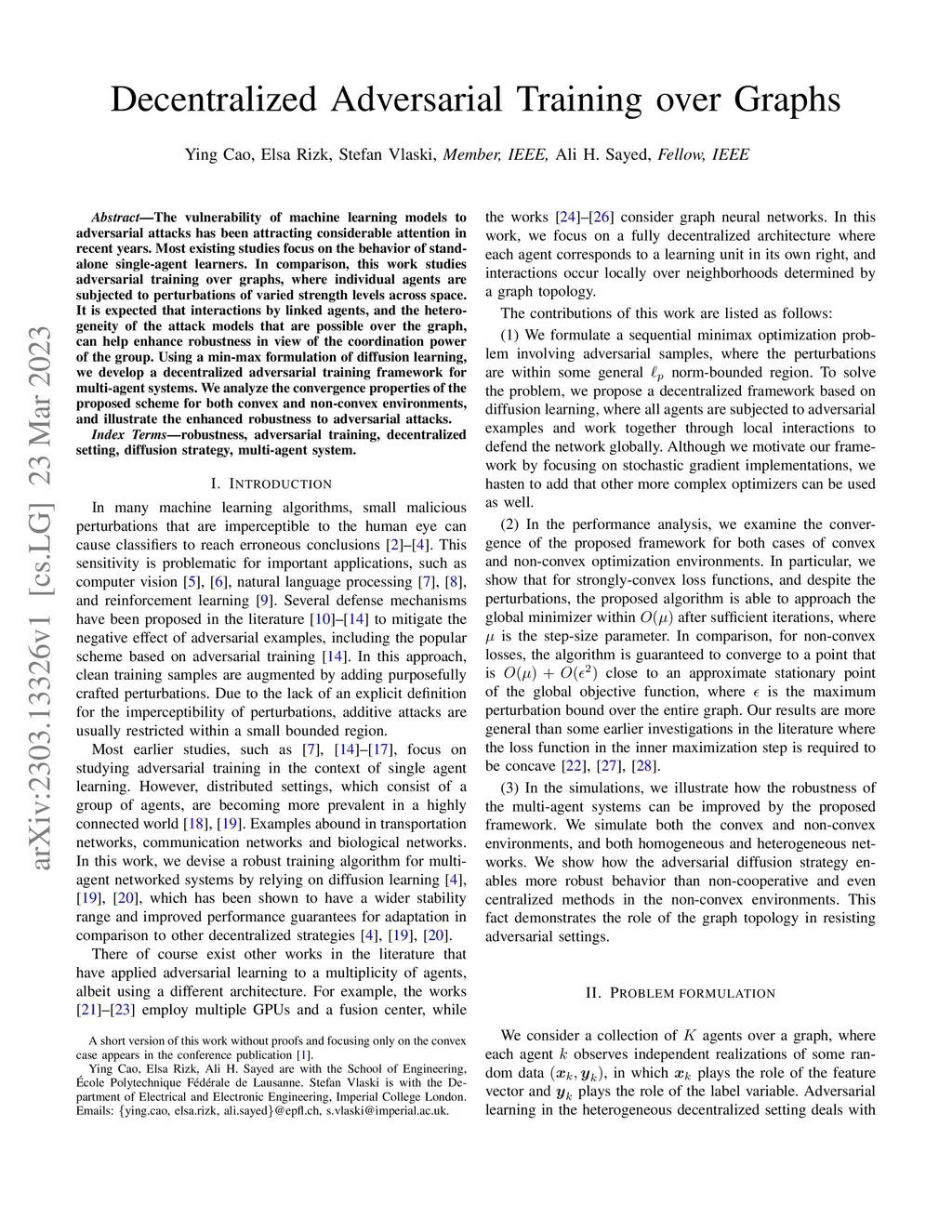 The vulnerability of machine learning models to adversarial attacks has been attracting considerable attention in recent years. Most existing studies focus on the behavior of stand-alone single-agent learners. In comparison, this work studies adversarial training over graphs, where individual agents are subjected to perturbations of varied strength levels across space. It is expected that interactions by linked agents, and the heterogeneity of the attack models that are possible over the graph, can help enhance robustness in view of the coordination power of the group. Using a min-max formulation of distributed learning, we develop a decentralized adversarial training framework for multi-agent systems. Specifically, we devise two decentralized adversarial training algorithms by relying on two popular decentralized learning strategies--diffusion and consensus. We analyze the convergence properties of the proposed framework for strongly-convex, convex, and non-convex environments, and illustrate the enhanced robustness to adversarial attacks.