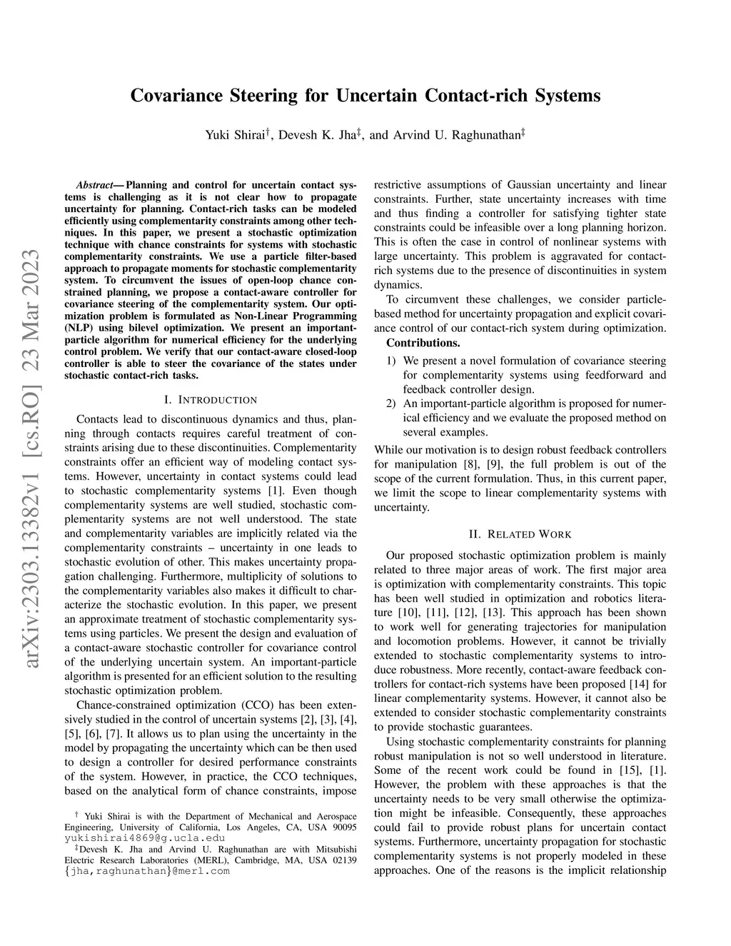 Planning and control for uncertain contact systems is challenging as it is not clear how to propagate uncertainty for planning. Contact-rich tasks can be modeled efficiently using complementarity constraints among other techniques. In this paper, we present a stochastic optimization technique with chance constraints for systems with stochastic complementarity constraints. We use a particle filter-based approach to propagate moments for stochastic complementarity system. To circumvent the issues of open-loop chance constrained planning, we propose a contact-aware controller for covariance steering of the complementarity system. Our optimization problem is formulated as Non-Linear Programming (NLP) using bilevel optimization. We present an important-particle algorithm for numerical efficiency for the underlying control problem. We verify that our contact-aware closed-loop controller is able to steer the covariance of the states under stochastic contact-rich tasks.