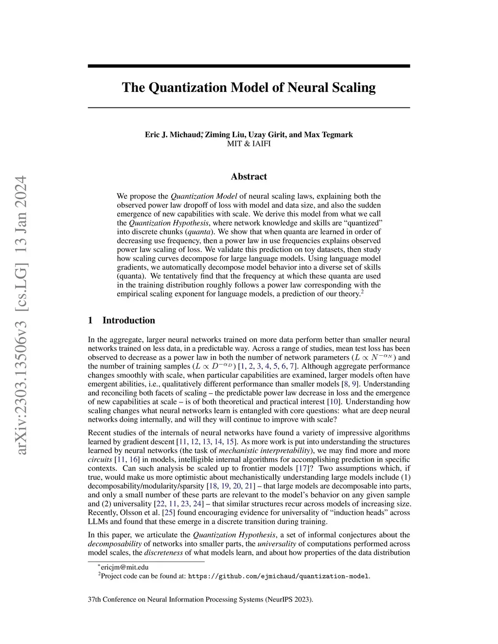 We propose the Quantization Model of neural scaling laws, explaining both the observed power law dropoff of loss with model and data size, and also the sudden emergence of new capabilities with scale. We derive this model from what we call the Quantization Hypothesis, where network knowledge and skills are "quantized" into discrete chunks (). We show that when quanta are learned in order of decreasing use frequency, then a power law in use frequencies explains observed power law scaling of loss. We validate this prediction on toy datasets, then study how scaling curves decompose for large language models. Using language model gradients, we automatically decompose model behavior into a diverse set of skills (quanta). We tentatively find that the frequency at which these quanta are used in the training distribution roughly follows a power law corresponding with the empirical scaling exponent for language models, a prediction of our theory.