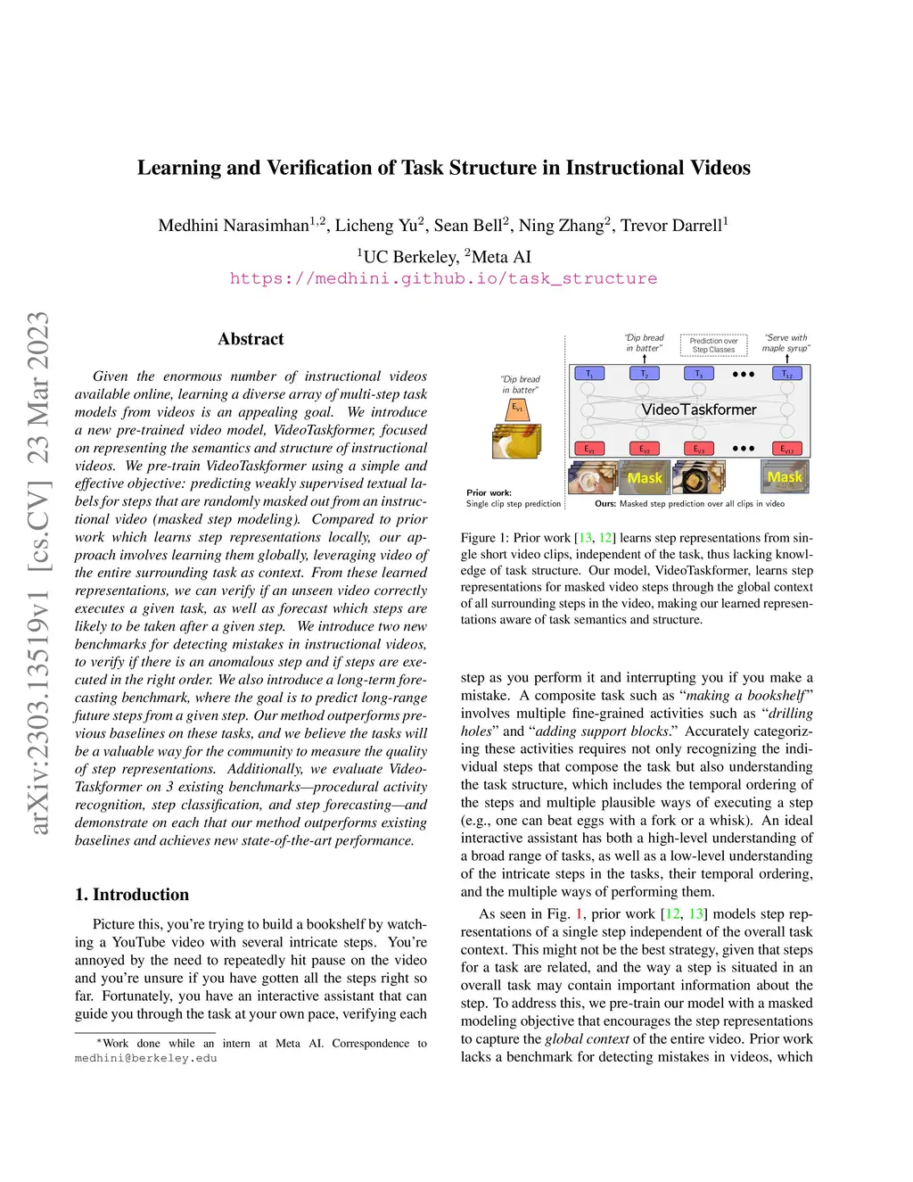 Given the enormous number of instructional videos available online, learning a diverse array of multi-step task models from videos is an appealing goal. We introduce a new pre-trained video model, VideoTaskformer, focused on representing the semantics and structure of instructional videos. We pre-train VideoTaskformer using a simple and effective objective: predicting weakly supervised textual labels for steps that are randomly masked out from an instructional video (masked step modeling). Compared to prior work which learns step representations locally, our approach involves learning them globally, leveraging video of the entire surrounding task as context. From these learned representations, we can verify if an unseen video correctly executes a given task, as well as forecast which steps are likely to be taken after a given step. We introduce two new benchmarks for detecting mistakes in instructional videos, to verify if there is an anomalous step and if steps are executed in the right order. We also introduce a long-term forecasting benchmark, where the goal is to predict long-range future steps from a given step. Our method outperforms previous baselines on these tasks, and we believe the tasks will be a valuable way for the community to measure the quality of step representations. Additionally, we evaluate VideoTaskformer on 3 existing benchmarks -- procedural activity recognition, step classification, and step forecasting -- and demonstrate on each that our method outperforms existing baselines and achieves new state-of-the-art performance.
