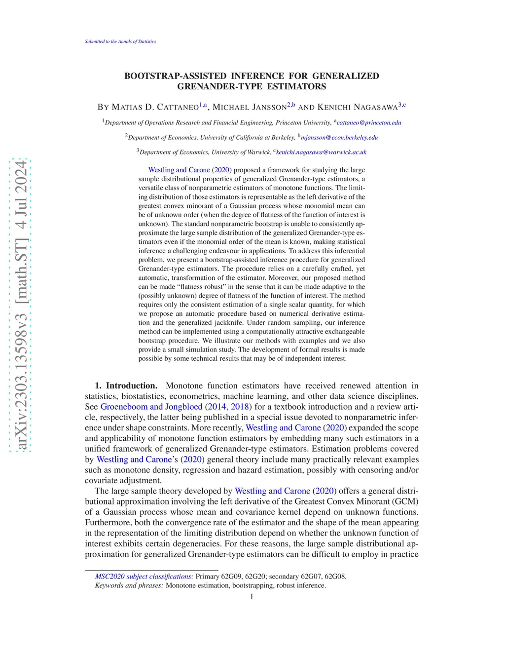 Westling and Carone (2020) proposed a framework for studying the large sample distributional properties of generalized Grenander-type estimators, a versatile class of nonparametric estimators of monotone functions. The limiting distribution of those estimators is representable as the left derivative of the greatest convex minorant of a Gaussian process whose monomial mean can be of unknown order (when the degree of flatness of the function of interest is unknown). The standard nonparametric bootstrap is unable to consistently approximate the large sample distribution of the generalized Grenander-type estimators even if the monomial order of the mean is known, making statistical inference a challenging endeavour in applications. To address this inferential problem, we present a bootstrap-assisted inference procedure for generalized Grenander-type estimators. The procedure relies on a carefully crafted, yet automatic, transformation of the estimator. Moreover, our proposed method can be made ``flatness robust'' in the sense that it can be made adaptive to the (possibly unknown) degree of flatness of the function of interest. The method requires only the consistent estimation of a single scalar quantity, for which we propose an automatic procedure based on numerical derivative estimation and the generalized jackknife. Under random sampling, our inference method can be implemented using a computationally attractive exchangeable bootstrap procedure. We illustrate our methods with examples and we also provide a small simulation study. The development of formal results is made possible by some technical results that may be of independent interest.