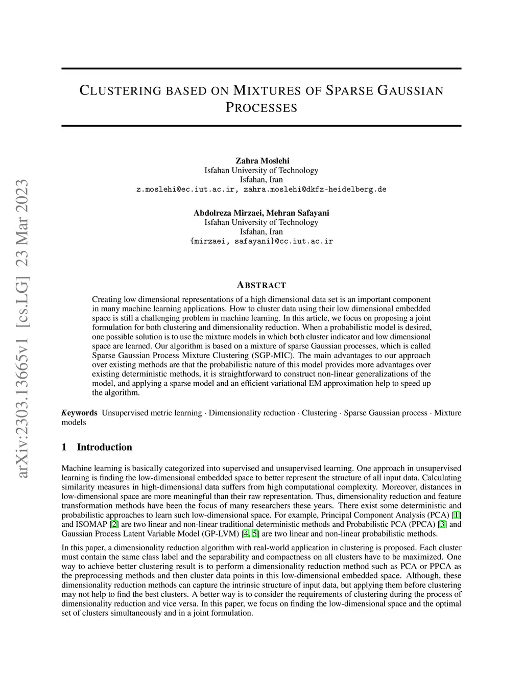 Creating low dimensional representations of a high dimensional data set is an important component in many machine learning applications. How to cluster data using their low dimensional embedded space is still a challenging problem in machine learning. In this article, we focus on proposing a joint formulation for both clustering and dimensionality reduction. When a probabilistic model is desired, one possible solution is to use the mixture models in which both cluster indicator and low dimensional space are learned. Our algorithm is based on a mixture of sparse Gaussian processes, which is called Sparse Gaussian Process Mixture Clustering (SGP-MIC). The main advantages to our approach over existing methods are that the probabilistic nature of this model provides more advantages over existing deterministic methods, it is straightforward to construct non-linear generalizations of the model, and applying a sparse model and an efficient variational EM approximation help to speed up the algorithm.