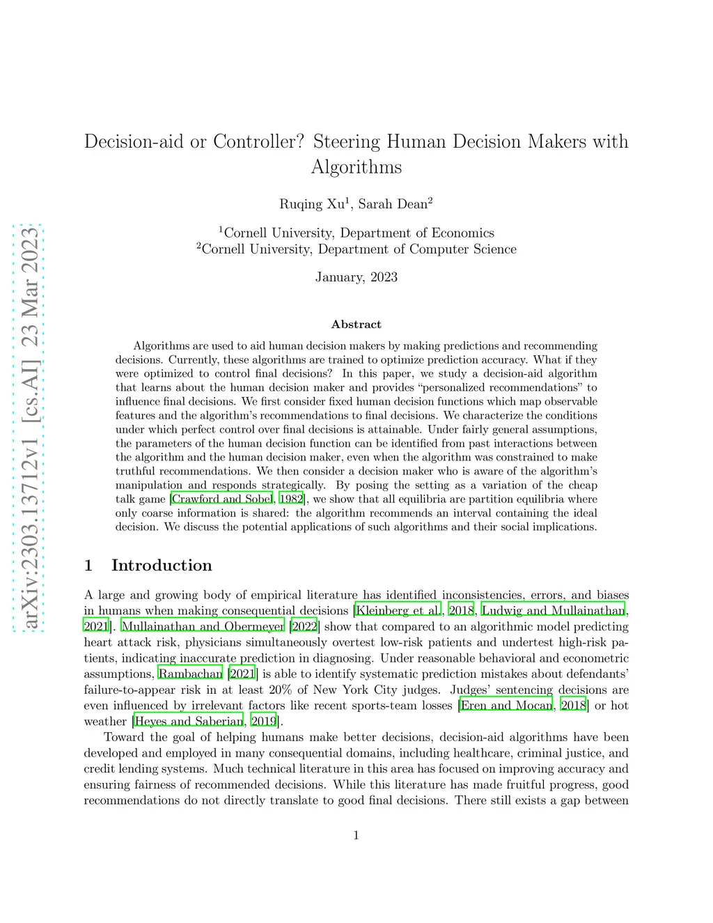 Algorithms are used to aid human decision makers by making predictions and recommending decisions. Currently, these algorithms are trained to optimize prediction accuracy. What if they were optimized to control final decisions? In this paper, we study a decision-aid algorithm that learns about the human decision maker and provides ''personalized recommendations'' to influence final decisions. We first consider fixed human decision functions which map observable features and the algorithm's recommendations to final decisions. We characterize the conditions under which perfect control over final decisions is attainable. Under fairly general assumptions, the parameters of the human decision function can be identified from past interactions between the algorithm and the human decision maker, even when the algorithm was constrained to make truthful recommendations. We then consider a decision maker who is aware of the algorithm's manipulation and responds strategically. By posing the setting as a variation of the cheap talk game [Crawford and Sobel, 1982], we show that all equilibria are partition equilibria where only coarse information is shared: the algorithm recommends an interval containing the ideal decision. We discuss the potential applications of such algorithms and their social implications.