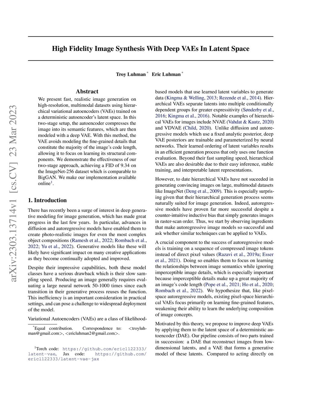 We present fast, realistic image generation on high-resolution, multimodal datasets using hierarchical variational autoencoders (VAEs) trained on a deterministic autoencoder's latent space. In this two-stage setup, the autoencoder compresses the image into its semantic features, which are then modeled with a deep VAE. With this method, the VAE avoids modeling the fine-grained details that constitute the majority of the image's code length, allowing it to focus on learning its structural components. We demonstrate the effectiveness of our two-stage approach, achieving a FID of 9.34 on the ImageNet-256 dataset which is comparable to BigGAN. We make our implementation available online.