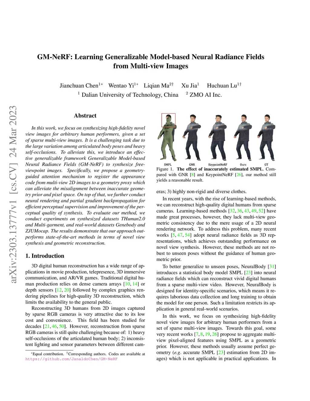 In this work, we focus on synthesizing high-fidelity novel view images for arbitrary human performers, given a set of sparse multi-view images. It is a challenging task due to the large variation among articulated body poses and heavy self-occlusions. To alleviate this, we introduce an effective generalizable framework Generalizable Model-based Neural Radiance Fields (GM-NeRF) to synthesize free-viewpoint images. Specifically, we propose a geometry-guided attention mechanism to register the appearance code from multi-view 2D images to a geometry proxy which can alleviate the misalignment between inaccurate geometry prior and pixel space. On top of that, we further conduct neural rendering and partial gradient backpropagation for efficient perceptual supervision and improvement of the perceptual quality of synthesis. To evaluate our method, we conduct experiments on synthesized datasets THuman2.0 and Multi-garment, and real-world datasets Genebody and ZJUMocap. The results demonstrate that our approach outperforms state-of-the-art methods in terms of novel view synthesis and geometric reconstruction.