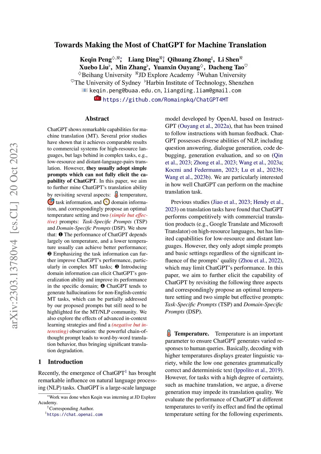 ChatGPT shows remarkable capabilities for machine translation (MT). Several prior studies have shown that it achieves comparable results to commercial systems for high-resource languages, but lags behind in complex tasks, e.g., low-resource and distant-language-pairs translation. However, they usually adopt simple prompts which can not fully elicit the capability of ChatGPT. In this paper, we aim to further mine ChatGPT's translation ability by revisiting several aspects: temperature, task information, and domain information, and correspondingly propose an optimal temperature setting and two (simple but effective) prompts: Task-Specific Prompts (TSP) and Domain-Specific Prompts (DSP). We show that: 1) The performance of ChatGPT depends largely on temperature, and a lower temperature usually can achieve better performance; 2) Emphasizing the task information can further improve ChatGPT's performance, particularly in complex MT tasks; 3) Introducing domain information can elicit ChatGPT's generalization ability and improve its performance in the specific domain; 4) ChatGPT tends to generate hallucinations for non-English-centric MT tasks, which can be partially addressed by our proposed prompts but still need to be highlighted for the MT/NLP community. We also explore the effects of advanced in-context learning strategies and find a (negative but interesting) observation: the powerful chain-of-thought prompt leads to word-by-word translation behavior, thus bringing significant translation degradation.