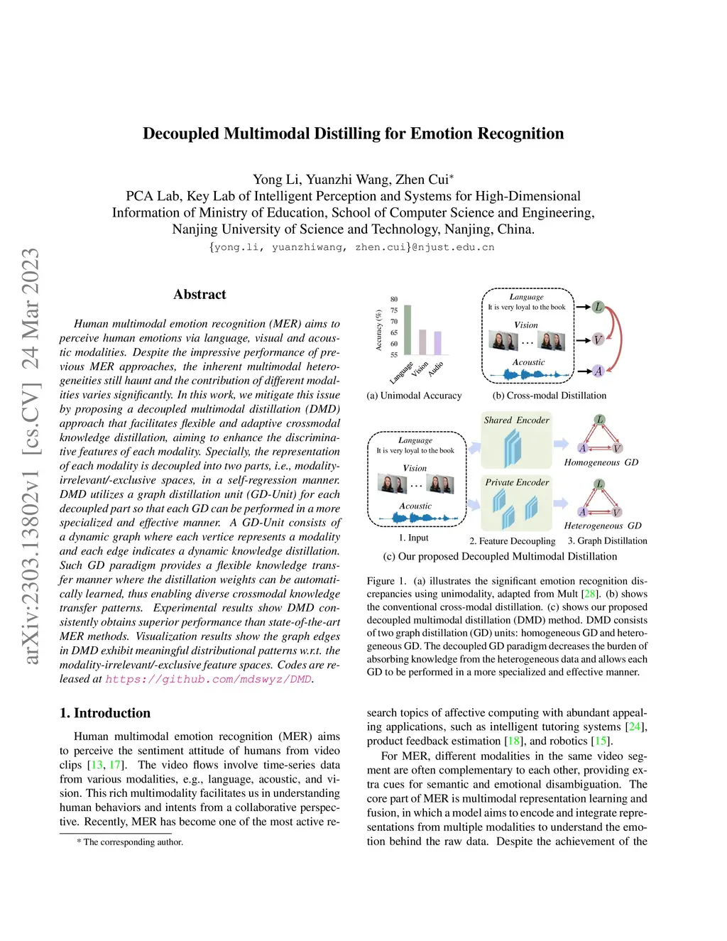 Human multimodal emotion recognition (MER) aims to perceive human emotions via language, visual and acoustic modalities. Despite the impressive performance of previous MER approaches, the inherent multimodal heterogeneities still haunt and the contribution of different modalities varies significantly. In this work, we mitigate this issue by proposing a decoupled multimodal distillation (DMD) approach that facilitates flexible and adaptive crossmodal knowledge distillation, aiming to enhance the discriminative features of each modality. Specially, the representation of each modality is decoupled into two parts, i.e., modality-irrelevant/-exclusive spaces, in a self-regression manner. DMD utilizes a graph distillation unit (GD-Unit) for each decoupled part so that each GD can be performed in a more specialized and effective manner. A GD-Unit consists of a dynamic graph where each vertice represents a modality and each edge indicates a dynamic knowledge distillation. Such GD paradigm provides a flexible knowledge transfer manner where the distillation weights can be automatically learned, thus enabling diverse crossmodal knowledge transfer patterns. Experimental results show DMD consistently obtains superior performance than state-of-the-art MER methods. Visualization results show the graph edges in DMD exhibit meaningful distributional patterns w.r.t. the modality-irrelevant/-exclusive feature spaces. Codes are released at \url{https://github.com/mdswyz/DMD}.