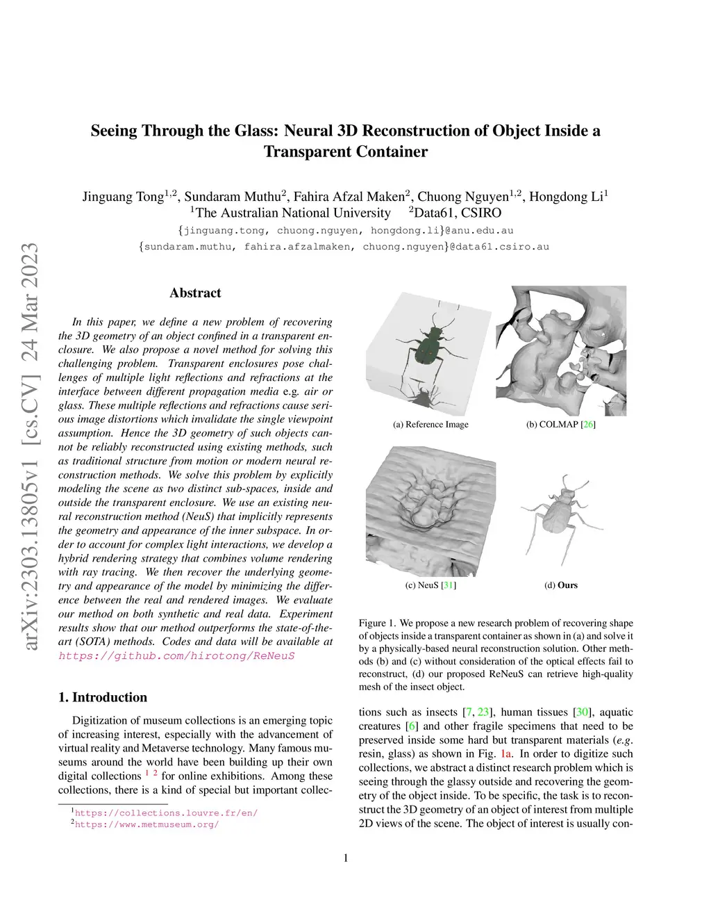 In this paper, we define a new problem of recovering the 3D geometry of an object confined in a transparent enclosure. We also propose a novel method for solving this challenging problem. Transparent enclosures pose challenges of multiple light reflections and refractions at the interface between different propagation media e.g. air or glass. These multiple reflections and refractions cause serious image distortions which invalidate the single viewpoint assumption. Hence the 3D geometry of such objects cannot be reliably reconstructed using existing methods, such as traditional structure from motion or modern neural reconstruction methods. We solve this problem by explicitly modeling the scene as two distinct sub-spaces, inside and outside the transparent enclosure. We use an existing neural reconstruction method (NeuS) that implicitly represents the geometry and appearance of the inner subspace. In order to account for complex light interactions, we develop a hybrid rendering strategy that combines volume rendering with ray tracing. We then recover the underlying geometry and appearance of the model by minimizing the difference between the real and hybrid rendered images. We evaluate our method on both synthetic and real data. Experiment results show that our method outperforms the state-of-the-art (SOTA) methods. Codes and data will be available at https://github.com/hirotong/ReNeuS