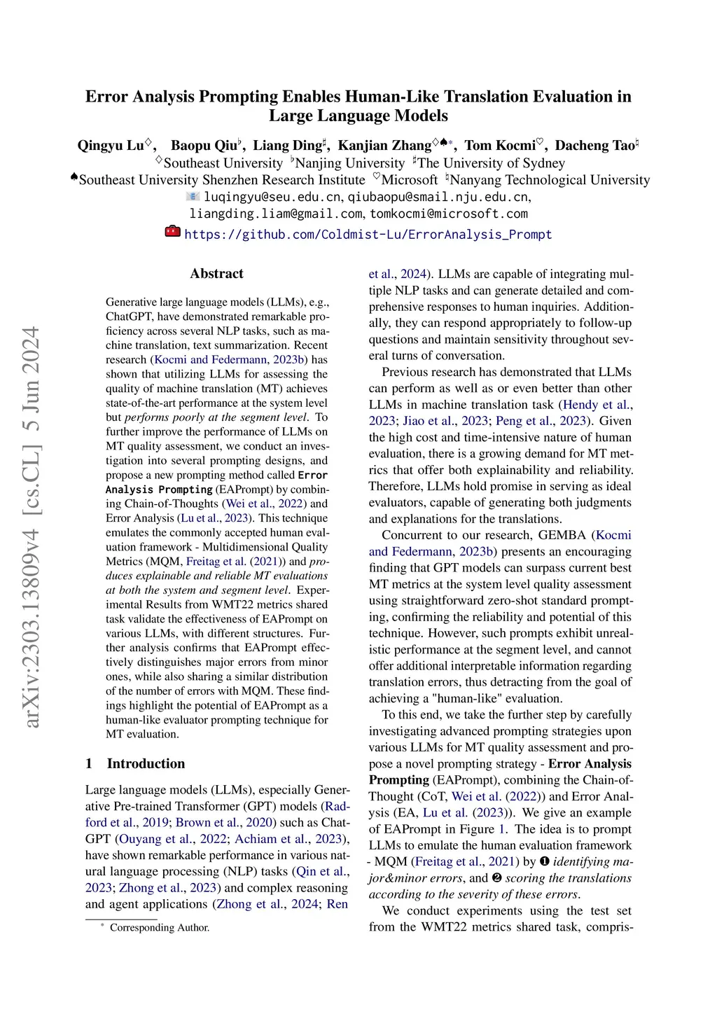 Generative large language models (LLMs), e.g., ChatGPT, have demonstrated remarkable proficiency across several NLP tasks, such as machine translation, text summarization. Recent research (Kocmi and Federmann, 2023) has shown that utilizing LLMs for assessing the quality of machine translation (MT) achieves state-of-the-art performance at the system level but \textit{performs poorly at the segment level}. To further improve the performance of LLMs on MT quality assessment, we investigate several prompting designs, and propose a new prompting method called \textbf{\texttt{Error Analysis Prompting}} (EAPrompt) by combining Chain-of-Thoughts (Wei et al., 2022) and Error Analysis (Lu et al., 2023). This technique emulates the commonly accepted human evaluation framework - Multidimensional Quality Metrics (MQM, Freitag et al. (2021)) and \textit{produces explainable and reliable MT evaluations at both the system and segment level}. Experimental Results from the WMT22 metrics shared task validate the effectiveness of EAPrompt on various LLMs, with different structures. Further analysis confirms that EAPrompt effectively distinguishes major errors from minor ones, while also sharing a similar distribution of the number of errors with MQM. These findings highlight the potential of EAPrompt as a human-like evaluator prompting technique for MT evaluation.