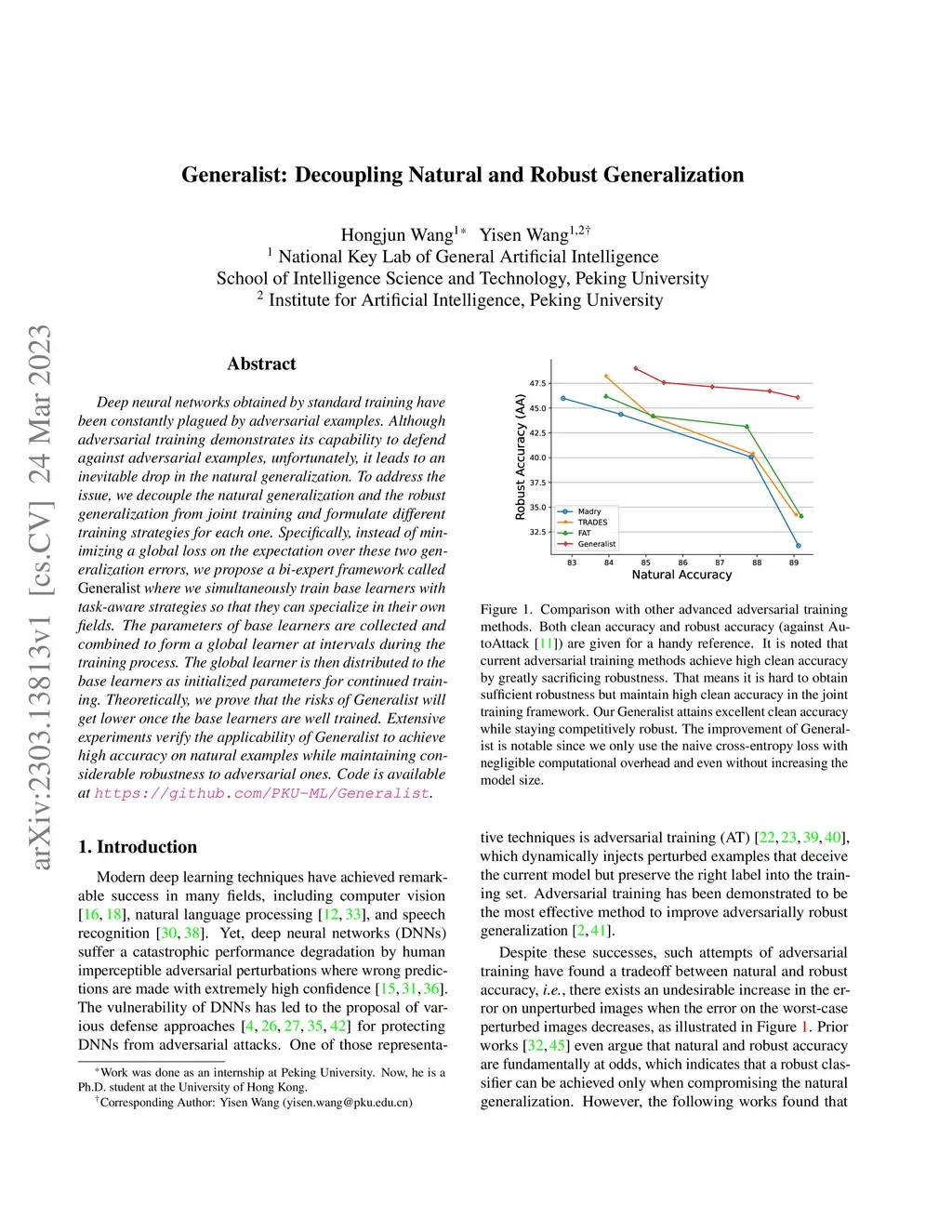 Deep neural networks obtained by standard training have been constantly plagued by adversarial examples. Although adversarial training demonstrates its capability to defend against adversarial examples, unfortunately, it leads to an inevitable drop in the natural generalization. To address the issue, we decouple the natural generalization and the robust generalization from joint training and formulate different training strategies for each one. Specifically, instead of minimizing a global loss on the expectation over these two generalization errors, we propose a bi-expert framework called \emph{Generalist} where we simultaneously train base learners with task-aware strategies so that they can specialize in their own fields. The parameters of base learners are collected and combined to form a global learner at intervals during the training process. The global learner is then distributed to the base learners as initialized parameters for continued training. Theoretically, we prove that the risks of Generalist will get lower once the base learners are well trained. Extensive experiments verify the applicability of Generalist to achieve high accuracy on natural examples while maintaining considerable robustness to adversarial ones. Code is available at https://github.com/PKU-ML/Generalist.