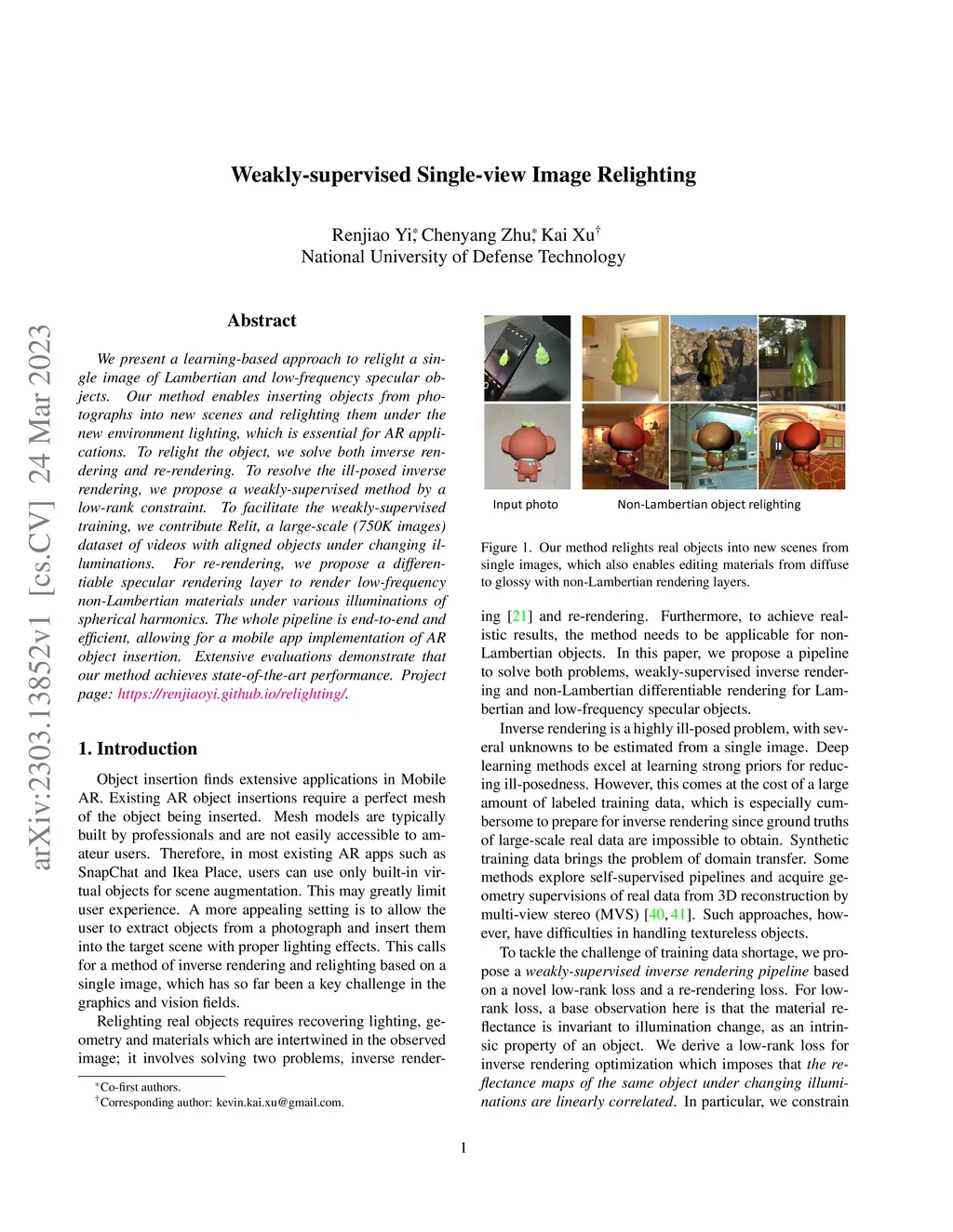 We present a learning-based approach to relight a single image of Lambertian and low-frequency specular objects. Our method enables inserting objects from photographs into new scenes and relighting them under the new environment lighting, which is essential for AR applications. To relight the object, we solve both inverse rendering and re-rendering. To resolve the ill-posed inverse rendering, we propose a weakly-supervised method by a low-rank constraint. To facilitate the weakly-supervised training, we contribute Relit, a large-scale (750K images) dataset of videos with aligned objects under changing illuminations. For re-rendering, we propose a differentiable specular rendering layer to render low-frequency non-Lambertian materials under various illuminations of spherical harmonics. The whole pipeline is end-to-end and efficient, allowing for a mobile app implementation of AR object insertion. Extensive evaluations demonstrate that our method achieves state-of-the-art performance. Project page: https://renjiaoyi.github.io/relighting/.