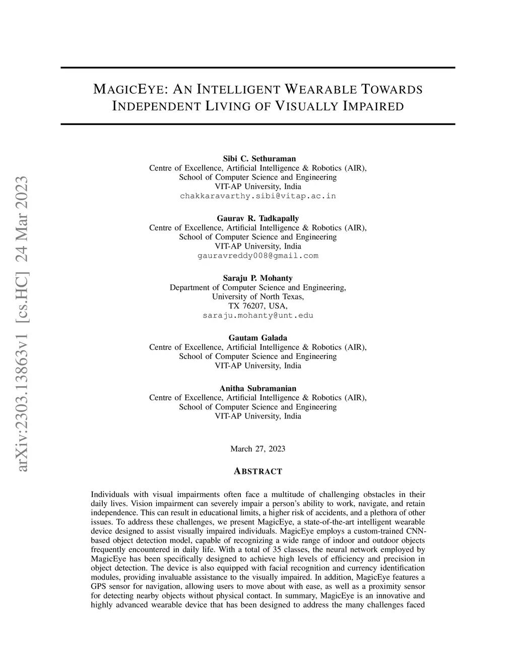 Individuals with visual impairments often face a multitude of challenging obstacles in their daily lives. Vision impairment can severely impair a person's ability to work, navigate, and retain independence. This can result in educational limits, a higher risk of accidents, and a plethora of other issues. To address these challenges, we present MagicEye, a state-of-the-art intelligent wearable device designed to assist visually impaired individuals. MagicEye employs a custom-trained CNN-based object detection model, capable of recognizing a wide range of indoor and outdoor objects frequently encountered in daily life. With a total of 35 classes, the neural network employed by MagicEye has been specifically designed to achieve high levels of efficiency and precision in object detection. The device is also equipped with facial recognition and currency identification modules, providing invaluable assistance to the visually impaired. In addition, MagicEye features a GPS sensor for navigation, allowing users to move about with ease, as well as a proximity sensor for detecting nearby objects without physical contact. In summary, MagicEye is an innovative and highly advanced wearable device that has been designed to address the many challenges faced by individuals with visual impairments. It is equipped with state-of-the-art object detection and navigation capabilities that are tailored to the needs of the visually impaired, making it one of the most promising solutions to assist those who are struggling with visual impairments.