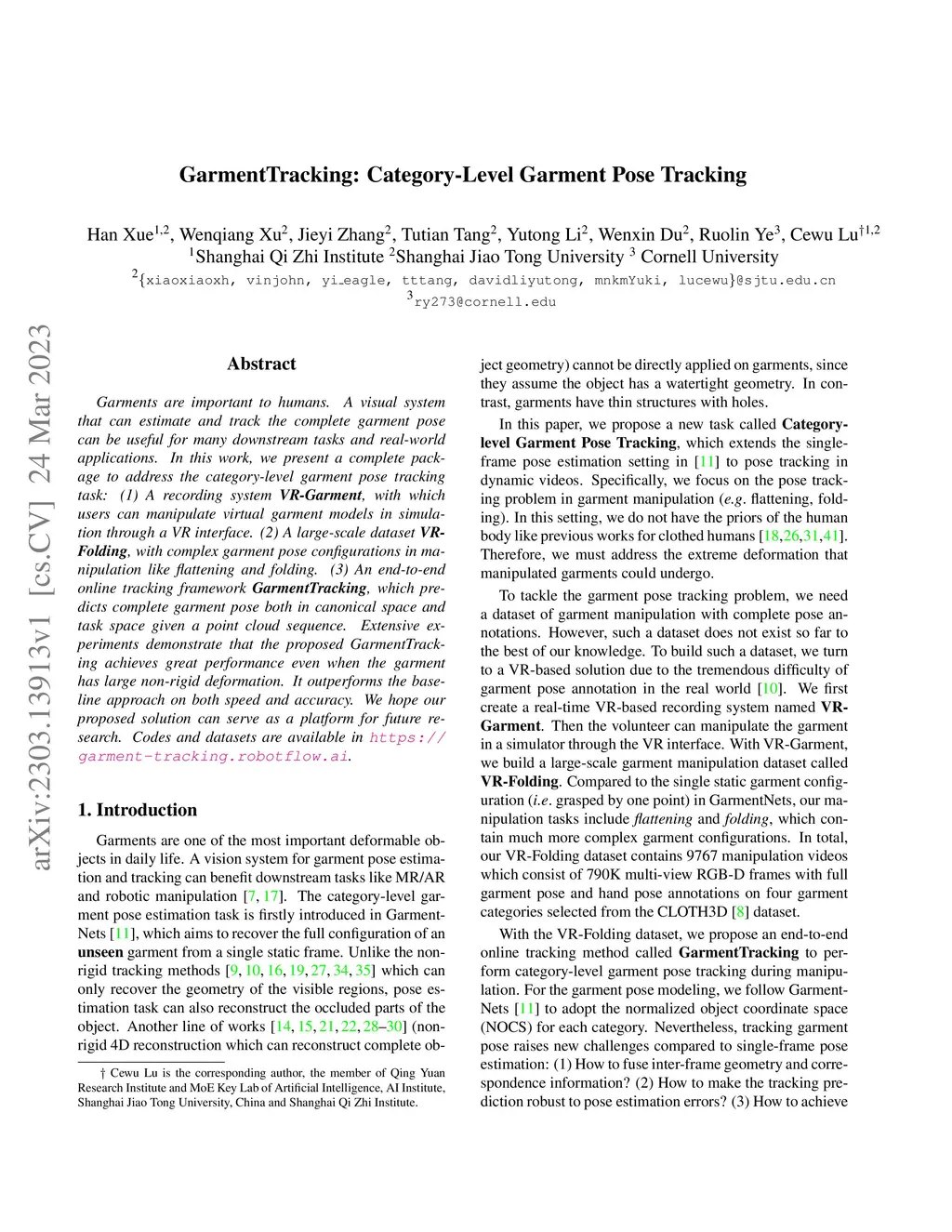 Garments are important to humans. A visual system that can estimate and track the complete garment pose can be useful for many downstream tasks and real-world applications. In this work, we present a complete package to address the category-level garment pose tracking task: (1) A recording system VR-Garment, with which users can manipulate virtual garment models in simulation through a VR interface. (2) A large-scale dataset VR-Folding, with complex garment pose configurations in manipulation like flattening and folding. (3) An end-to-end online tracking framework GarmentTracking, which predicts complete garment pose both in canonical space and task space given a point cloud sequence. Extensive experiments demonstrate that the proposed GarmentTracking achieves great performance even when the garment has large non-rigid deformation. It outperforms the baseline approach on both speed and accuracy. We hope our proposed solution can serve as a platform for future research. Codes and datasets are available inthis https URL.