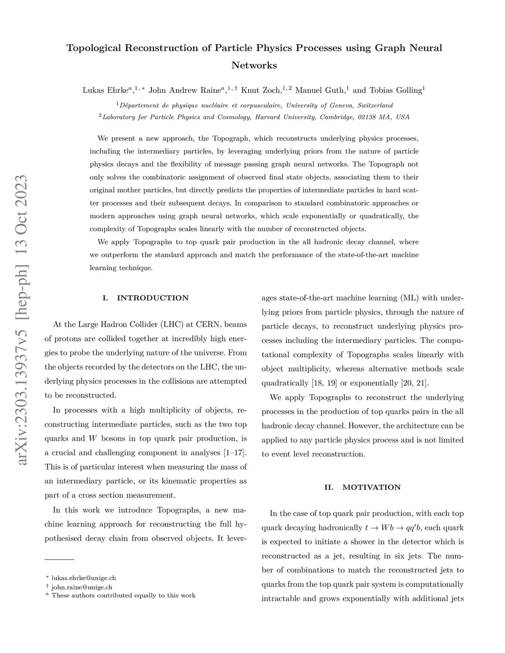 We present a new approach, the Topograph, which reconstructs underlying physics processes, including the intermediary particles, by leveraging underlying priors from the nature of particle physics decays and the flexibility of message passing graph neural networks. The Topograph not only solves the combinatoric assignment of observed final state objects, associating them to their original mother particles, but directly predicts the properties of intermediate particles in hard scatter processes and their subsequent decays. In comparison to standard combinatoric approaches or modern approaches using graph neural networks, which scale exponentially or quadratically, the complexity of Topographs scales linearly with the number of reconstructed objects. We apply Topographs to top quark pair production in the all hadronic decay channel, where we outperform the standard approach and match the performance of the state-of-the-art machine learning technique.