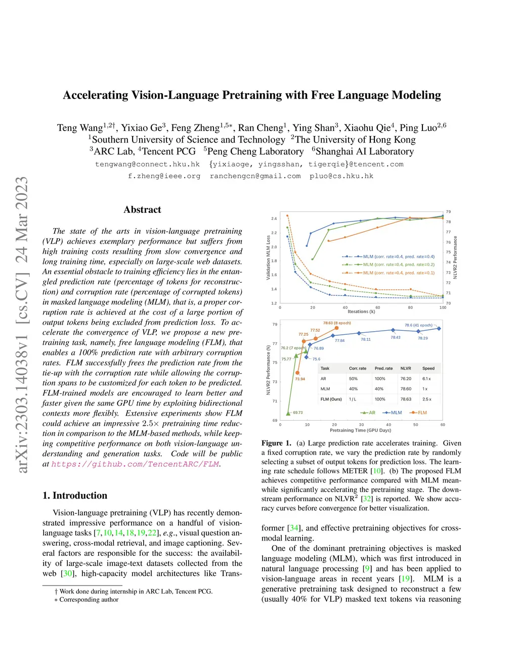The state of the arts in vision-language pretraining (VLP) achieves exemplary performance but suffers from high training costs resulting from slow convergence and long training time, especially on large-scale web datasets. An essential obstacle to training efficiency lies in the entangled prediction rate (percentage of tokens for reconstruction) and corruption rate (percentage of corrupted tokens) in masked language modeling (MLM), that is, a proper corruption rate is achieved at the cost of a large portion of output tokens being excluded from prediction loss. To accelerate the convergence of VLP, we propose a new pretraining task, namely, free language modeling (FLM), that enables a 100% prediction rate with arbitrary corruption rates. FLM successfully frees the prediction rate from the tie-up with the corruption rate while allowing the corruption spans to be customized for each token to be predicted. FLM-trained models are encouraged to learn better and faster given the same GPU time by exploiting bidirectional contexts more flexibly. Extensive experiments show FLM could achieve an impressive 2.5x pretraining time reduction in comparison to the MLM-based methods, while keeping competitive performance on both vision-language understanding and generation tasks. Code will be public at https://github.com/TencentARC/FLM.