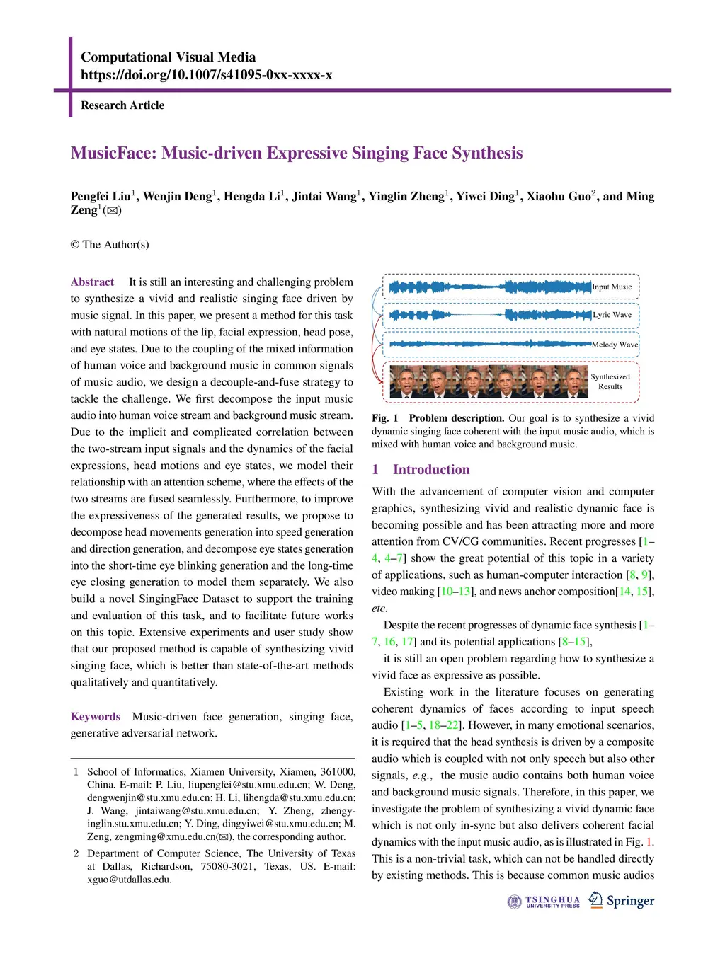 It is still an interesting and challenging problem to synthesize a vivid and realistic singing face driven by music signal. In this paper, we present a method for this task with natural motions of the lip, facial expression, head pose, and eye states. Due to the coupling of the mixed information of human voice and background music in common signals of music audio, we design a decouple-and-fuse strategy to tackle the challenge. We first decompose the input music audio into human voice stream and background music stream. Due to the implicit and complicated correlation between the two-stream input signals and the dynamics of the facial expressions, head motions and eye states, we model their relationship with an attention scheme, where the effects of the two streams are fused seamlessly. Furthermore, to improve the expressiveness of the generated results, we propose to decompose head movements generation into speed generation and direction generation, and decompose eye states generation into the short-time eye blinking generation and the long-time eye closing generation to model them separately. We also build a novel SingingFace Dataset to support the training and evaluation of this task, and to facilitate future works on this topic. Extensive experiments and user study show that our proposed method is capable of synthesizing vivid singing face, which is better than state-of-the-art methods qualitatively and quantitatively.