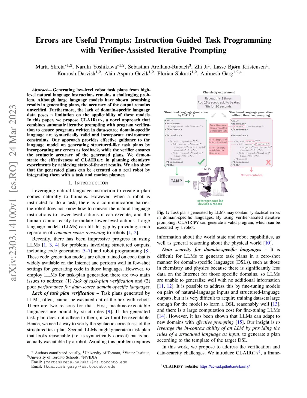 Generating low-level robot task plans from high-level natural language instructions remains a challenging problem. Although large language models have shown promising results in generating plans, the accuracy of the output remains unverified. Furthermore, the lack of domain-specific language data poses a limitation on the applicability of these models. In this paper, we propose CLAIRIFY, a novel approach that combines automatic iterative prompting with program verification to ensure programs written in data-scarce domain-specific language are syntactically valid and incorporate environment constraints. Our approach provides effective guidance to the language model on generating structured-like task plans by incorporating any errors as feedback, while the verifier ensures the syntactic accuracy of the generated plans. We demonstrate the effectiveness of CLAIRIFY in planning chemistry experiments by achieving state-of-the-art results. We also show that the generated plans can be executed on a real robot by integrating them with a task and motion planner.