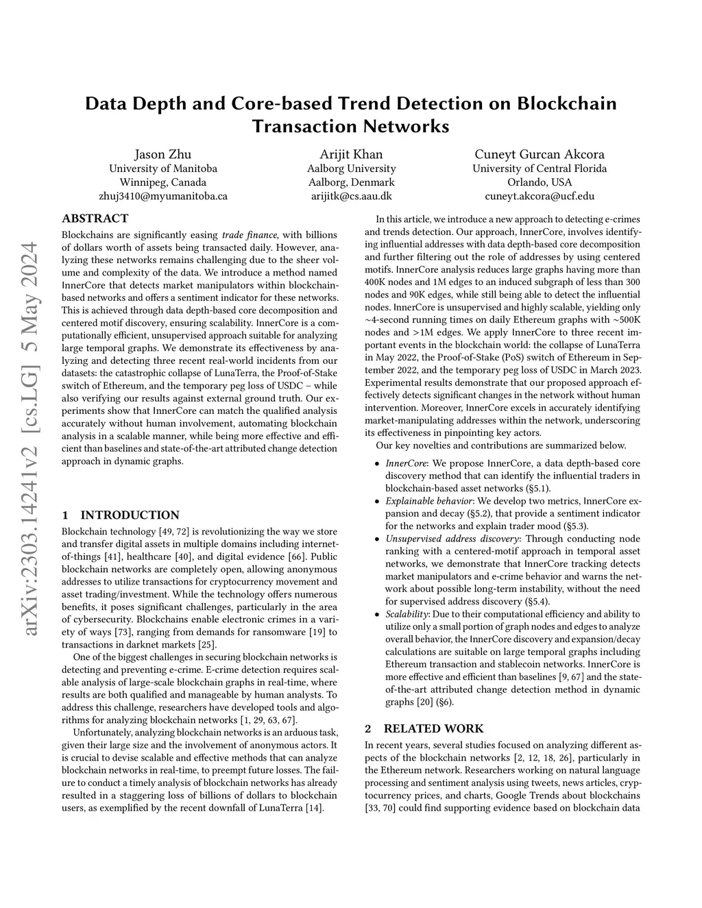 Blockchains are significantly easing trade finance, with billions of dollars worth of assets being transacted daily. However, analyzing these networks remains challenging due to the sheer volume and complexity of the data. We introduce a method named InnerCore that detects market manipulators within blockchain-based networks and offers a sentiment indicator for these networks. This is achieved through data depth-based core decomposition and centered motif discovery, ensuring scalability. InnerCore is a computationally efficient, unsupervised approach suitable for analyzing large temporal graphs. We demonstrate its effectiveness by analyzing and detecting three recent real-world incidents from our datasets: the catastrophic collapse of LunaTerra, the Proof-of-Stake switch of Ethereum, and the temporary peg loss of USDC - while also verifying our results against external ground truth. Our experiments show that InnerCore can match the qualified analysis accurately without human involvement, automating blockchain analysis in a scalable manner, while being more effective and efficient than baselines and state-of-the-art attributed change detection approach in dynamic graphs.