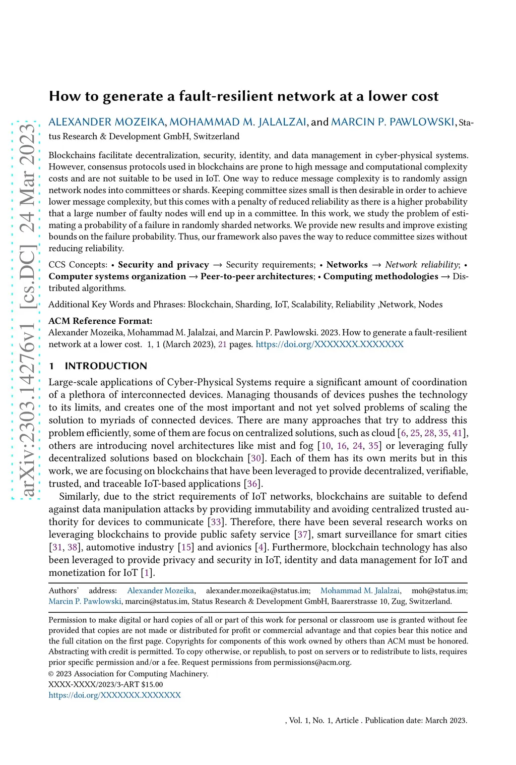 Blockchains facilitate decentralization, security, identity, and data management in cyber-physical systems. However, consensus protocols used in blockchains are prone to high message and computational complexity costs and are not suitable to be used in IoT. One way to reduce message complexity is to randomly assign network nodes into committees or shards. Keeping committee sizes small is then desirable in order to achieve lower message complexity, but this comes with a penalty of reduced reliability as there is a higher probability that a large number of faulty nodes will end up in a committee. In this work, we study the problem of estimating a probability of a failure in randomly sharded networks. We provide new results and improve existing bounds on the failure probability. Thus, our framework also paves the way to reduce committee sizes without reducing reliability.