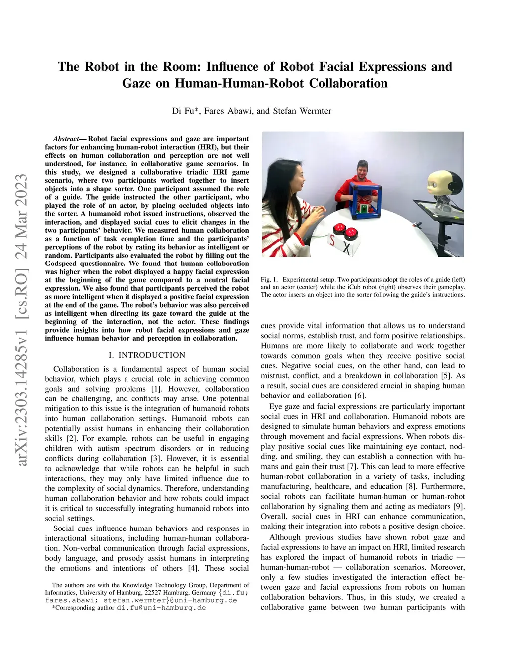 Robot facial expressions and gaze are important factors for enhancing human-robot interaction (HRI), but their effects on human collaboration and perception are not well understood, for instance, in collaborative game scenarios. In this study, we designed a collaborative triadic HRI game scenario, where two participants worked together to insert objects into a shape sorter. One participant assumed the role of a guide. The guide instructed the other participant, who played the role of an actor, by placing occluded objects into the sorter. A humanoid robot issued instructions, observed the interaction, and displayed social cues to elicit changes in the two participants' behavior. We measured human collaboration as a function of task completion time and the participants' perceptions of the robot by rating its behavior as intelligent or random. Participants also evaluated the robot by filling out the Godspeed questionnaire. We found that human collaboration was higher when the robot displayed a happy facial expression at the beginning of the game compared to a neutral facial expression. We also found that participants perceived the robot as more intelligent when it displayed a positive facial expression at the end of the game. The robot's behavior was also perceived as intelligent when directing its gaze toward the guide at the beginning of the interaction, not the actor. These findings provide insights into how robot facial expressions and gaze influence human behavior and perception in collaboration.