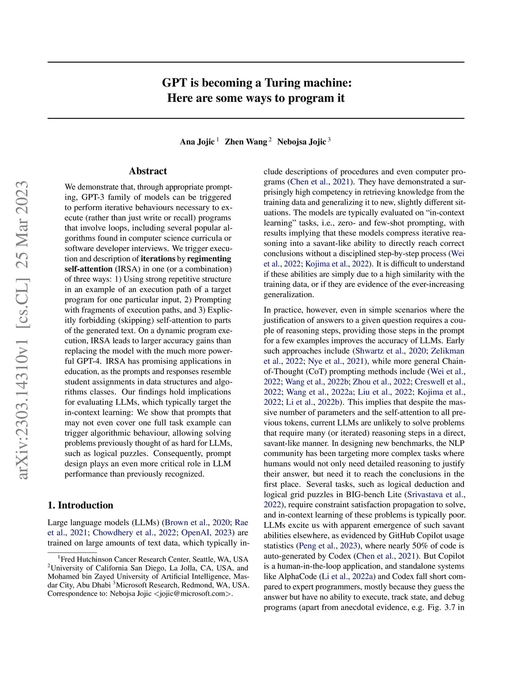 We demonstrate that, through appropriate prompting, GPT-3 family of models can be triggered to perform iterative behaviours necessary to execute (rather than just write or recall) programs that involve loops, including several popular algorithms found in computer science curricula or software developer interviews. We trigger execution and description of Iterations by Regimenting Self-Attention (IRSA) in one (or a combination) of three ways: 1) Using strong repetitive structure in an example of an execution path of a target program for one particular input, 2) Prompting with fragments of execution paths, and 3) Explicitly forbidding (skipping) self-attention to parts of the generated text. On a dynamic program execution, IRSA leads to larger accuracy gains than replacing the model with the much more powerful GPT-4. IRSA has promising applications in education, as the prompts and responses resemble student assignments in data structures and algorithms classes. Our findings hold implications for evaluating LLMs, which typically target the in-context learning: We show that prompts that may not even cover one full task example can trigger algorithmic behaviour, allowing solving problems previously thought of as hard for LLMs, such as logical puzzles. Consequently, prompt design plays an even more critical role in LLM performance than previously recognized.