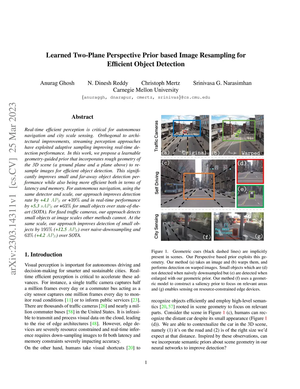 Real-time efficient perception is critical for autonomous navigation and city scale sensing. Orthogonal to architectural improvements, streaming perception approaches have exploited adaptive sampling improving real-time detection performance. In this work, we propose a learnable geometry-guided prior that incorporates rough geometry of the 3D scene (a ground plane and a plane above) to resample images for efficient object detection. This significantly improves small and far-away object detection performance while also being more efficient both in terms of latency and memory. For autonomous navigation, using the same detector and scale, our approach improves detection rate by +4.1 or +39% and in real-time performance by +5.3 or +63% for small objects over state-of-the-art (SOTA). For fixed traffic cameras, our approach detects small objects at image scales other methods cannot. At the same scale, our approach improves detection of small objects by 195% (+12.5 ) over naive-downsampling and 63% (+4.2 ) over SOTA.
