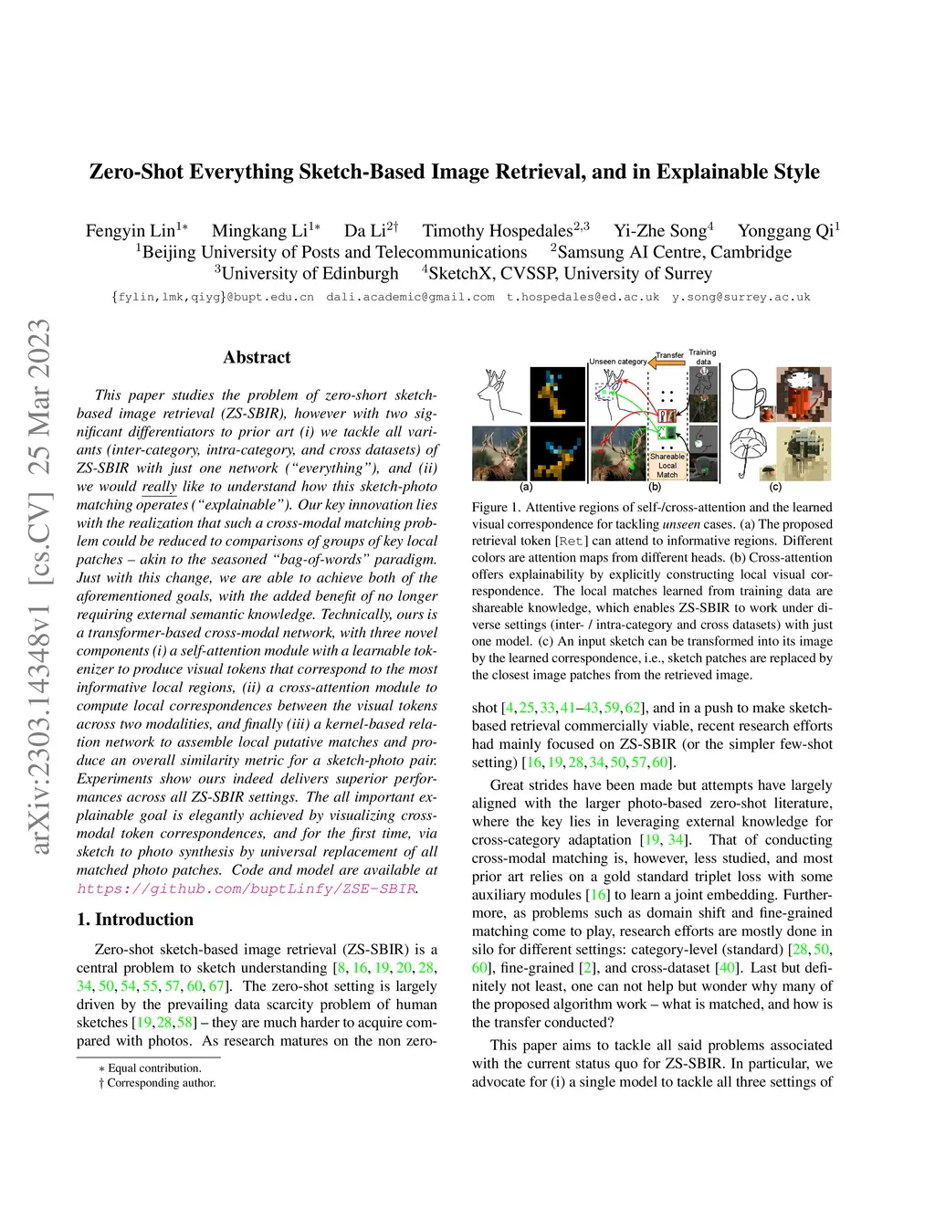 This paper studies the problem of zero-short sketch-based image retrieval (ZS-SBIR), however with two significant differentiators to prior art (i) we tackle all variants (inter-category, intra-category, and cross datasets) of ZS-SBIR with just one network (``everything''), and (ii) we would really like to understand how this sketch-photo matching operates (``explainable''). Our key innovation lies with the realization that such a cross-modal matching problem could be reduced to comparisons of groups of key local patches -- akin to the seasoned ``bag-of-words'' paradigm. Just with this change, we are able to achieve both of the aforementioned goals, with the added benefit of no longer requiring external semantic knowledge. Technically, ours is a transformer-based cross-modal network, with three novel components (i) a self-attention module with a learnable tokenizer to produce visual tokens that correspond to the most informative local regions, (ii) a cross-attention module to compute local correspondences between the visual tokens across two modalities, and finally (iii) a kernel-based relation network to assemble local putative matches and produce an overall similarity metric for a sketch-photo pair. Experiments show ours indeed delivers superior performances across all ZS-SBIR settings. The all important explainable goal is elegantly achieved by visualizing cross-modal token correspondences, and for the first time, via sketch to photo synthesis by universal replacement of all matched photo patches. Code and model are available at \url{https://github.com/buptLinfy/ZSE-SBIR}.