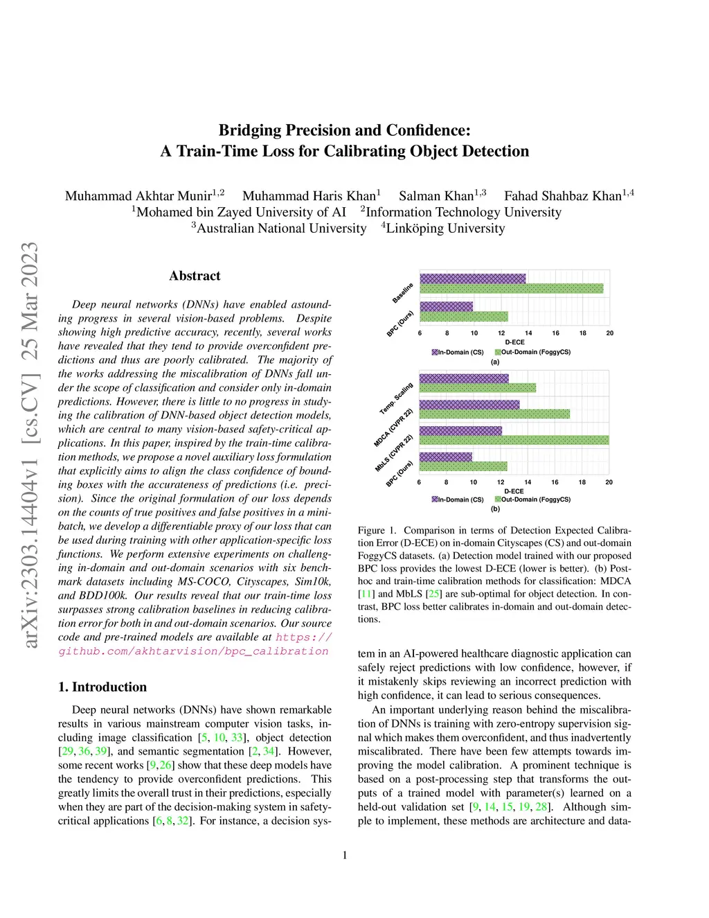 Deep neural networks (DNNs) have enabled astounding progress in several vision-based problems. Despite showing high predictive accuracy, recently, several works have revealed that they tend to provide overconfident predictions and thus are poorly calibrated. The majority of the works addressing the miscalibration of DNNs fall under the scope of classification and consider only in-domain predictions. However, there is little to no progress in studying the calibration of DNN-based object detection models, which are central to many vision-based safety-critical applications. In this paper, inspired by the train-time calibration methods, we propose a novel auxiliary loss formulation that explicitly aims to align the class confidence of bounding boxes with the accurateness of predictions (i.e. precision). Since the original formulation of our loss depends on the counts of true positives and false positives in a minibatch, we develop a differentiable proxy of our loss that can be used during training with other application-specific loss functions. We perform extensive experiments on challenging in-domain and out-domain scenarios with six benchmark datasets including MS-COCO, Cityscapes, Sim10k, and BDD100k. Our results reveal that our train-time loss surpasses strong calibration baselines in reducing calibration error for both in and out-domain scenarios. Our source code and pre-trained models are available at https://github.com/akhtarvision/bpc_calibration