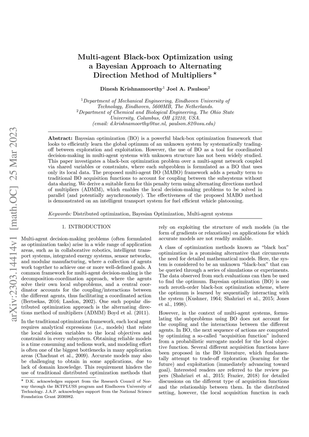 Bayesian optimization (BO) is a powerful black-box optimization framework that looks to efficiently learn the global optimum of an unknown system by systematically trading-off between exploration and exploitation. However, the use of BO as a tool for coordinated decision-making in multi-agent systems with unknown structure has not been widely studied. This paper investigates a black-box optimization problem over a multi-agent network coupled via shared variables or constraints, where each subproblem is formulated as a BO that uses only its local data. The proposed multi-agent BO (MABO) framework adds a penalty term to traditional BO acquisition functions to account for coupling between the subsystems without data sharing. We derive a suitable form for this penalty term using alternating directions method of multipliers (ADMM), which enables the local decision-making problems to be solved in parallel (and potentially asynchronously). The effectiveness of the proposed MABO method is demonstrated on an intelligent transport system for fuel efficient vehicle platooning.