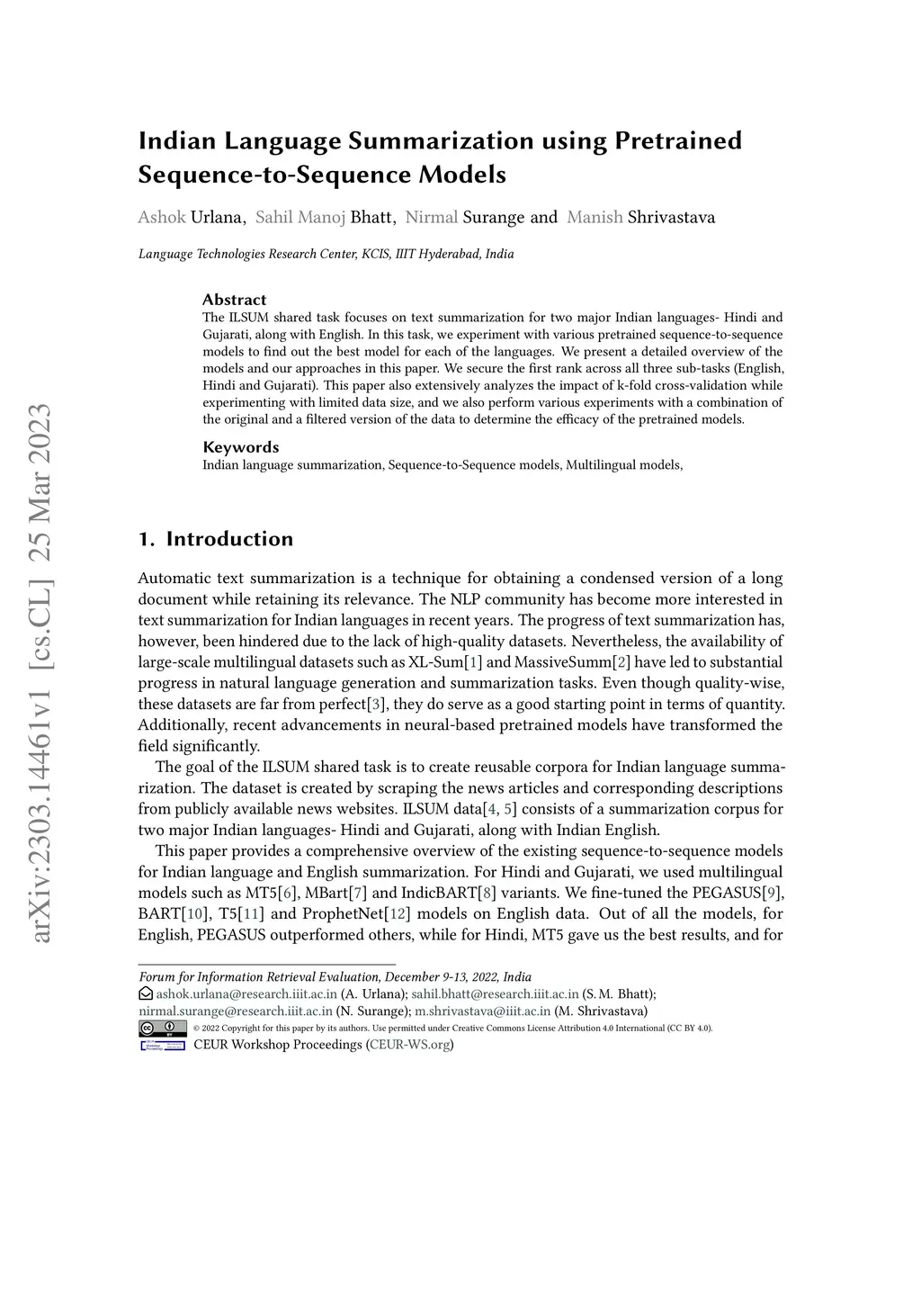 The ILSUM shared task focuses on text summarization for two major Indian languages- Hindi and Gujarati, along with English. In this task, we experiment with various pretrained sequence-to-sequence models to find out the best model for each of the languages. We present a detailed overview of the models and our approaches in this paper. We secure the first rank across all three sub-tasks (English, Hindi and Gujarati). This paper also extensively analyzes the impact of k-fold cross-validation while experimenting with limited data size, and we also perform various experiments with a combination of the original and a filtered version of the data to determine the efficacy of the pretrained models.