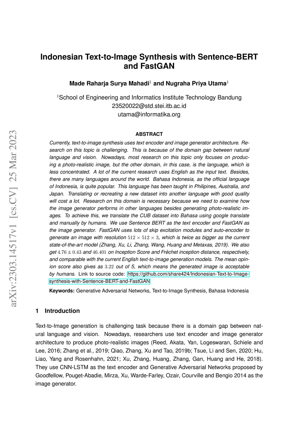 Indonesian Text-to-Image Synthesis with Sentence-BERT and FastGAN