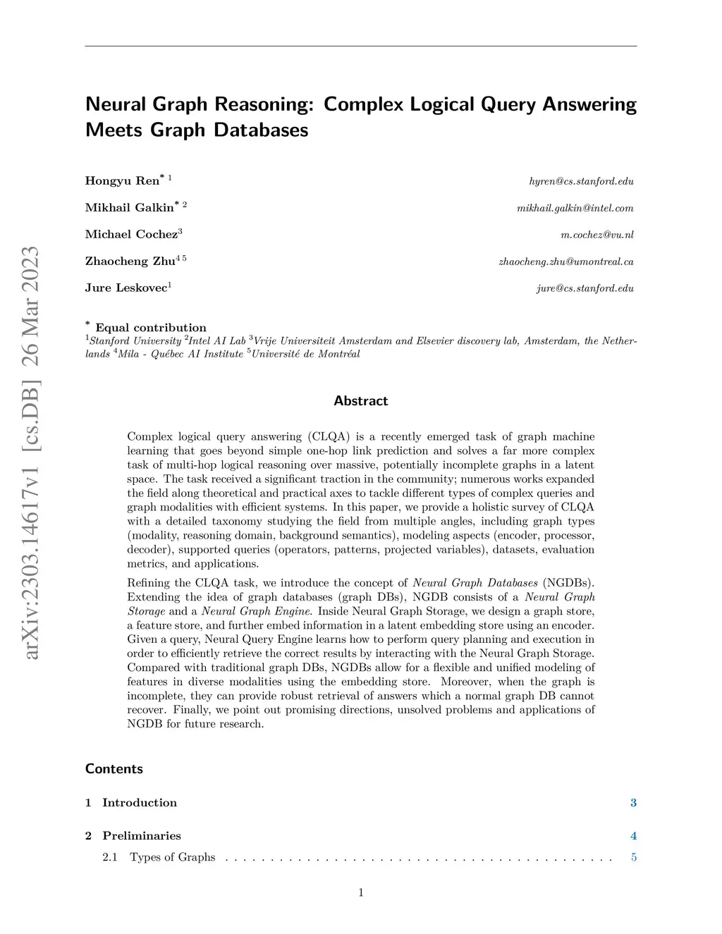 Complex logical query answering (CLQA) is a recently emerged task of graph machine learning that goes beyond simple one-hop link prediction and solves a far more complex task of multi-hop logical reasoning over massive, potentially incomplete graphs in a latent space. The task received a significant traction in the community; numerous works expanded the field along theoretical and practical axes to tackle different types of complex queries and graph modalities with efficient systems. In this paper, we provide a holistic survey of CLQA with a detailed taxonomy studying the field from multiple angles, including graph types (modality, reasoning domain, background semantics), modeling aspects (encoder, processor, decoder), supported queries (operators, patterns, projected variables), datasets, evaluation metrics, and applications. Refining the CLQA task, we introduce the concept of Neural Graph Databases (NGDBs). Extending the idea of graph databases (graph DBs), NGDB consists of a Neural Graph Storage and a Neural Graph Engine. Inside Neural Graph Storage, we design a graph store, a feature store, and further embed information in a latent embedding store using an encoder. Given a query, Neural Query Engine learns how to perform query planning and execution in order to efficiently retrieve the correct results by interacting with the Neural Graph Storage. Compared with traditional graph DBs, NGDBs allow for a flexible and unified modeling of features in diverse modalities using the embedding store. Moreover, when the graph is incomplete, they can provide robust retrieval of answers which a normal graph DB cannot recover. Finally, we point out promising directions, unsolved problems and applications of NGDB for future research.