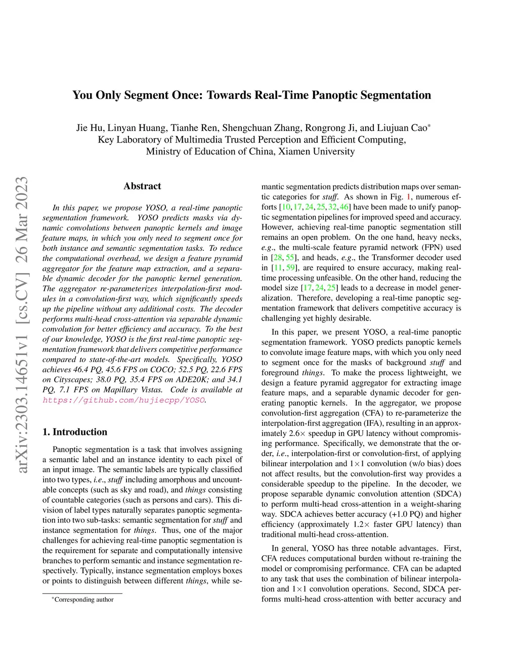 In this paper, we propose YOSO, a real-time panoptic segmentation framework. YOSO predicts masks via dynamic convolutions between panoptic kernels and image feature maps, in which you only need to segment once for both instance and semantic segmentation tasks. To reduce the computational overhead, we design a feature pyramid aggregator for the feature map extraction, and a separable dynamic decoder for the panoptic kernel generation. The aggregator re-parameterizes interpolation-first modules in a convolution-first way, which significantly speeds up the pipeline without any additional costs. The decoder performs multi-head cross-attention via separable dynamic convolution for better efficiency and accuracy. To the best of our knowledge, YOSO is the first real-time panoptic segmentation framework that delivers competitive performance compared to state-of-the-art models. Specifically, YOSO achieves 46.4 PQ, 45.6 FPS on COCO; 52.5 PQ, 22.6 FPS on Cityscapes; 38.0 PQ, 35.4 FPS on ADE20K; and 34.1 PQ, 7.1 FPS on Mapillary Vistas. Code is available at https://github.com/hujiecpp/YOSO.