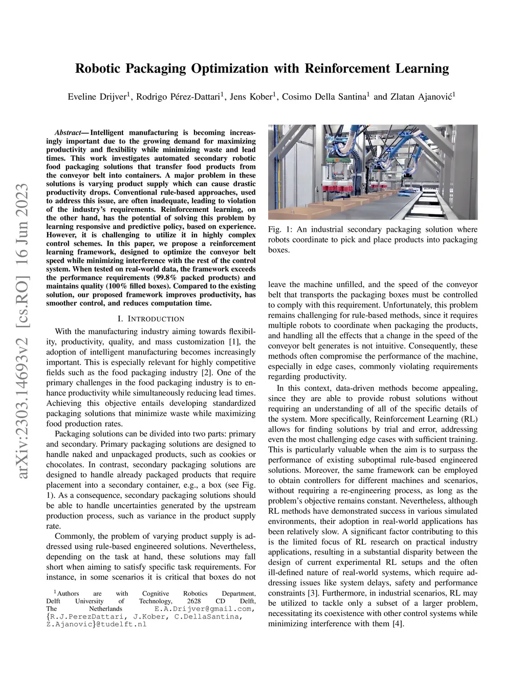 Intelligent manufacturing is becoming increasingly important due to the growing demand for maximizing productivity and flexibility while minimizing waste and lead times. This work investigates automated secondary robotic food packaging solutions that transfer food products from the conveyor belt into containers. A major problem in these solutions is varying product supply which can cause drastic productivity drops. Conventional rule-based approaches, used to address this issue, are often inadequate, leading to violation of the industry's requirements. Reinforcement learning, on the other hand, has the potential of solving this problem by learning responsive and predictive policy, based on experience. However, it is challenging to utilize it in highly complex control schemes. In this paper, we propose a reinforcement learning framework, designed to optimize the conveyor belt speed while minimizing interference with the rest of the control system. When tested on real-world data, the framework exceeds the performance requirements (99.8% packed products) and maintains quality (100% filled boxes). Compared to the existing solution, our proposed framework improves productivity, has smoother control, and reduces computation time.