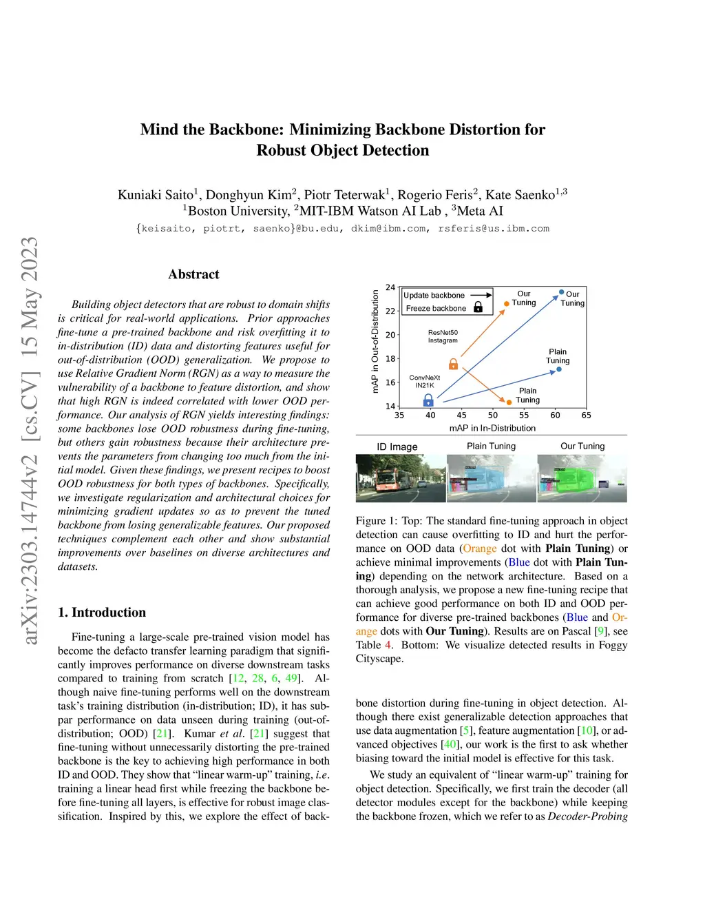 Building object detectors that are robust to domain shifts is critical for real-world applications. Prior approaches fine-tune a pre-trained backbone and risk overfitting it to in-distribution (ID) data and distorting features useful for out-of-distribution (OOD) generalization. We propose to use Relative Gradient Norm (RGN) as a way to measure the vulnerability of a backbone to feature distortion, and show that high RGN is indeed correlated with lower OOD performance. Our analysis of RGN yields interesting findings: some backbones lose OOD robustness during fine-tuning, but others gain robustness because their architecture prevents the parameters from changing too much from the initial model. Given these findings, we present recipes to boost OOD robustness for both types of backbones. Specifically, we investigate regularization and architectural choices for minimizing gradient updates so as to prevent the tuned backbone from losing generalizable features. Our proposed techniques complement each other and show substantial improvements over baselines on diverse architectures and datasets. Code is available at https://github.com/VisionLearningGroup/mind_back.