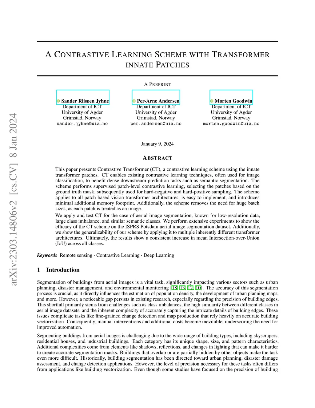 This paper presents Contrastive Transformer, a contrastive learning scheme using the Transformer innate patches. Contrastive Transformer enables existing contrastive learning techniques, often used for image classification, to benefit dense downstream prediction tasks such as semantic segmentation. The scheme performs supervised patch-level contrastive learning, selecting the patches based on the ground truth mask, subsequently used for hard-negative and hard-positive sampling. The scheme applies to all vision-transformer architectures, is easy to implement, and introduces minimal additional memory footprint. Additionally, the scheme removes the need for huge batch sizes, as each patch is treated as an image. We apply and test Contrastive Transformer for the case of aerial image segmentation, known for low-resolution data, large class imbalance, and similar semantic classes. We perform extensive experiments to show the efficacy of the Contrastive Transformer scheme on the ISPRS Potsdam aerial image segmentation dataset. Additionally, we show the generalizability of our scheme by applying it to multiple inherently different Transformer architectures. Ultimately, the results show a consistent increase in mean IoU across all classes.