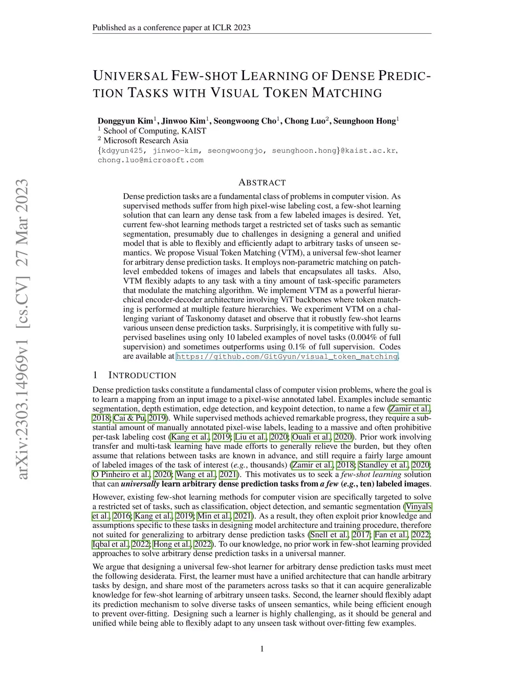 Dense prediction tasks are a fundamental class of problems in computer vision. As supervised methods suffer from high pixel-wise labeling cost, a few-shot learning solution that can learn any dense task from a few labeled images is desired. Yet, current few-shot learning methods target a restricted set of tasks such as semantic segmentation, presumably due to challenges in designing a general and unified model that is able to flexibly and efficiently adapt to arbitrary tasks of unseen semantics. We propose Visual Token Matching (VTM), a universal few-shot learner for arbitrary dense prediction tasks. It employs non-parametric matching on patch-level embedded tokens of images and labels that encapsulates all tasks. Also, VTM flexibly adapts to any task with a tiny amount of task-specific parameters that modulate the matching algorithm. We implement VTM as a powerful hierarchical encoder-decoder architecture involving ViT backbones where token matching is performed at multiple feature hierarchies. We experiment VTM on a challenging variant of Taskonomy dataset and observe that it robustly few-shot learns various unseen dense prediction tasks. Surprisingly, it is competitive with fully supervised baselines using only 10 labeled examples of novel tasks (0.004% of full supervision) and sometimes outperforms using 0.1% of full supervision. Codes are available at https://github.com/GitGyun/visual_token_matching.