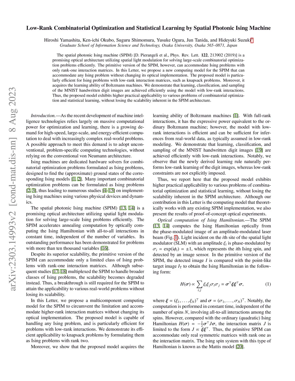 The spatial photonic Ising machine (SPIM) [D. Pierangeli et al., Phys. Rev. Lett. 122, 213902 (2019)] is a promising optical architecture utilizing spatial light modulation for solving large-scale combinatorial optimization problems efficiently. The primitive version of the SPIM, however, can accommodate Ising problems with only rank-one interaction matrices. In this Letter, we propose a new computing model for the SPIM that can accommodate any Ising problem without changing its optical implementation. The proposed model is particularly efficient for Ising problems with low-rank interaction matrices, such as knapsack problems. Moreover, it acquires the learning ability of Boltzmann machines. We demonstrate that learning, classification, and sampling of the MNIST handwritten digit images are achieved efficiently using the model with low-rank interactions. Thus, the proposed model exhibits higher practical applicability to various problems of combinatorial optimization and statistical learning, without losing the scalability inherent in the SPIM architecture.