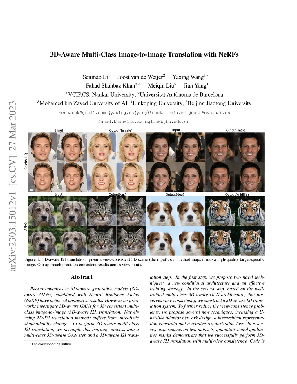 3D-Aware Multi-Class Image-to-Image Translation with NeRFs
