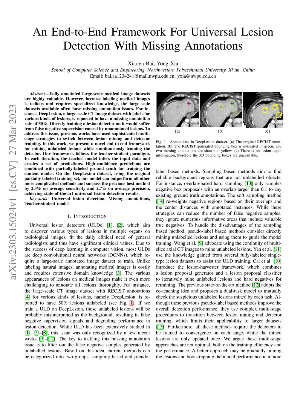 Fully annotated large-scale medical image datasets are highly valuable. However, because labeling medical images is tedious and requires specialized knowledge, the large-scale datasets available often have missing annotation issues. For instance, DeepLesion, a large-scale CT image dataset with labels for various kinds of lesions, is reported to have a missing annotation rate of 50\%. Directly training a lesion detector on it would suffer from false negative supervision caused by unannotated lesions. To address this issue, previous works have used sophisticated multi-stage strategies to switch between lesion mining and detector training. In this work, we present a novel end-to-end framework for mining unlabeled lesions while simultaneously training the detector. Our framework follows the teacher-student paradigm. In each iteration, the teacher model infers the input data and creates a set of predictions. High-confidence predictions are combined with partially-labeled ground truth for training the student model. On the DeepLesion dataset, using the original partially labeled training set, our model can outperform all other more complicated methods and surpass the previous best method by 2.3\% on average sensitivity and 2.7\% on average precision, achieving state-of-the-art universal lesion detection results.