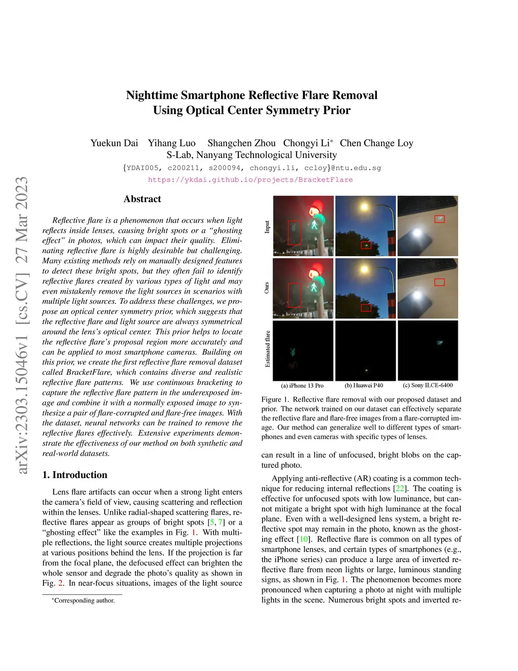 Nighttime Smartphone Reflective Flare Removal Using Optical Center
