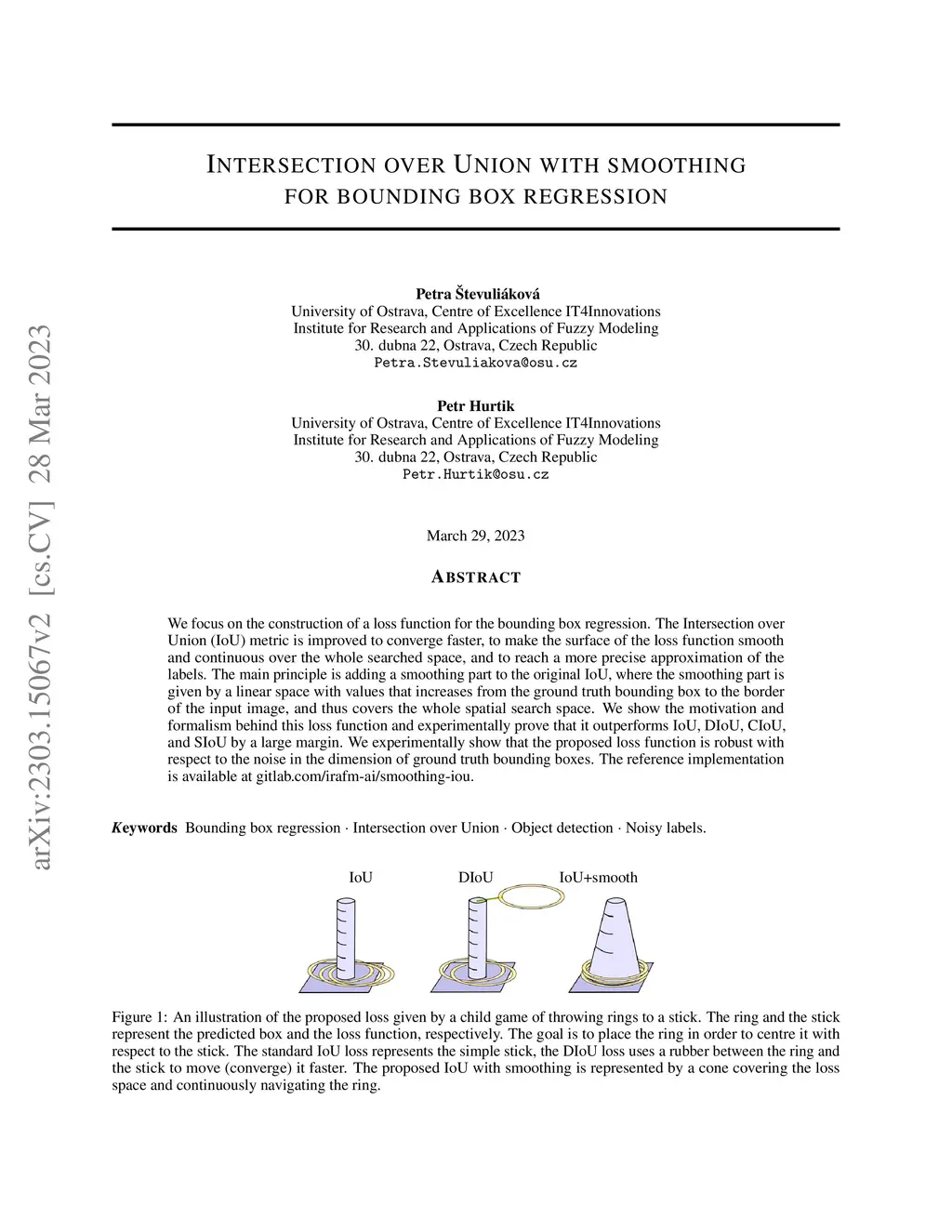We focus on the construction of a loss function for the bounding box regression. The Intersection over Union (IoU) metric is improved to converge faster, to make the surface of the loss function smooth and continuous over the whole searched space, and to reach a more precise approximation of the labels. The main principle is adding a smoothing part to the original IoU, where the smoothing part is given by a linear space with values that increases from the ground truth bounding box to the border of the input image, and thus covers the whole spatial search space. We show the motivation and formalism behind this loss function and experimentally prove that it outperforms IoU, DIoU, CIoU, and SIoU by a large margin. We experimentally show that the proposed loss function is robust with respect to the noise in the dimension of ground truth bounding boxes. The reference implementation is available at gitlab.com/irafm-ai/smoothing-iou.